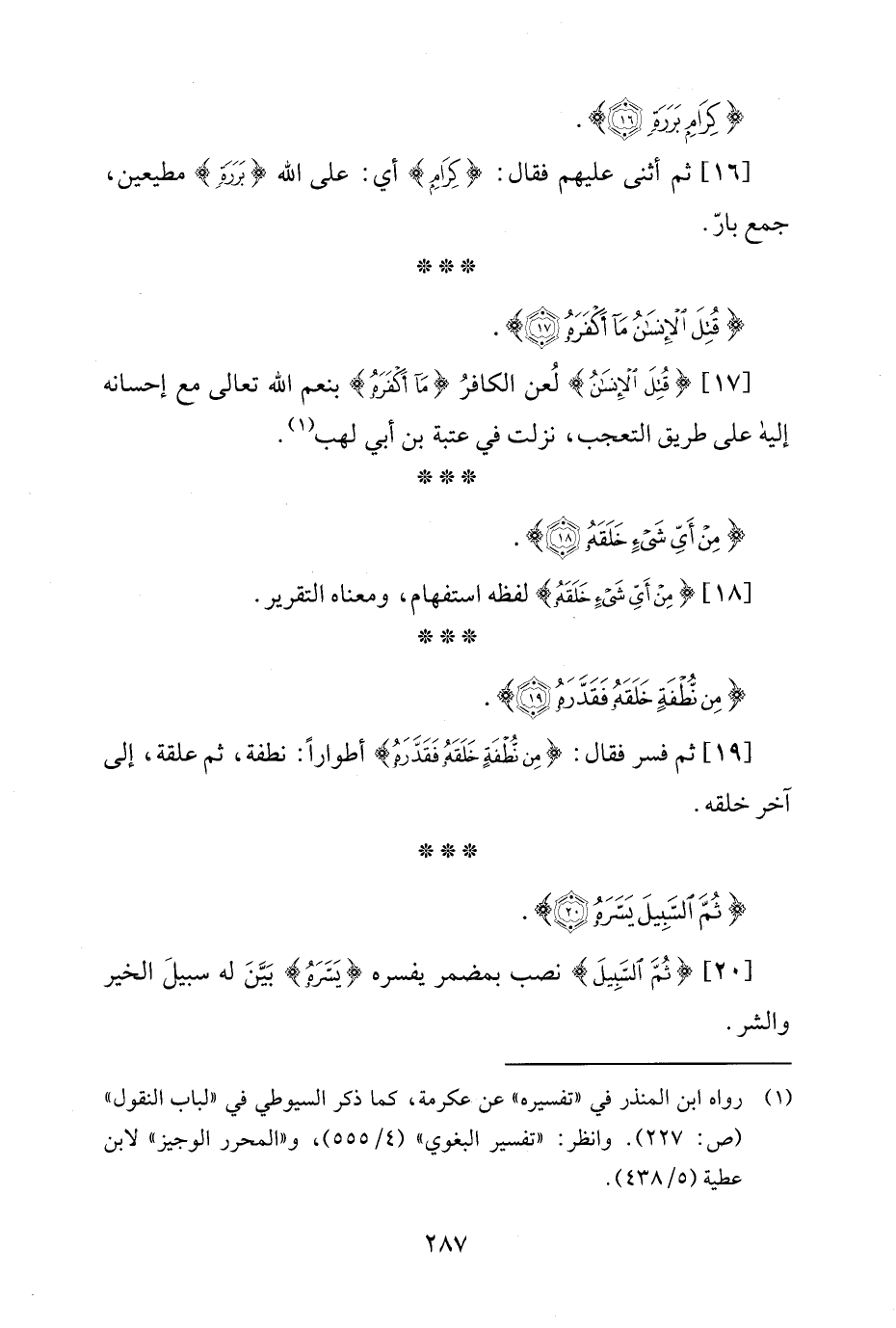 [17] {قُتِلَ الْإِنْسَانُ} لُعن الكافرُ {مَا أَكْفَرَهُ} بنعم الله تعالى مع إحسانه إليه على طريق التعجب، نزلت في عتبة بن أبي لهب (¬1).