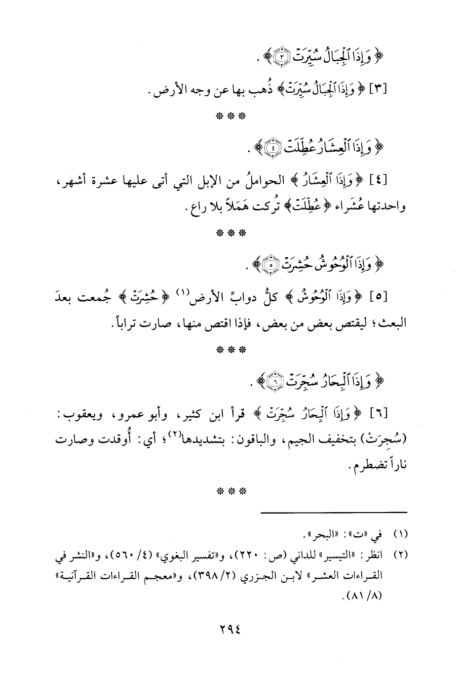 [6] {وَإِذَا الْبِحَارُ سُجِّرَتْ} قرأ ابن كثير، وأبو عمرو، ويعقوب: (سُجِرَتْ) بتخفيف الجيم، والباقون: بتشديدها (¬2)؛ أي: أُوقدت وصارت نارًا تضطرم.