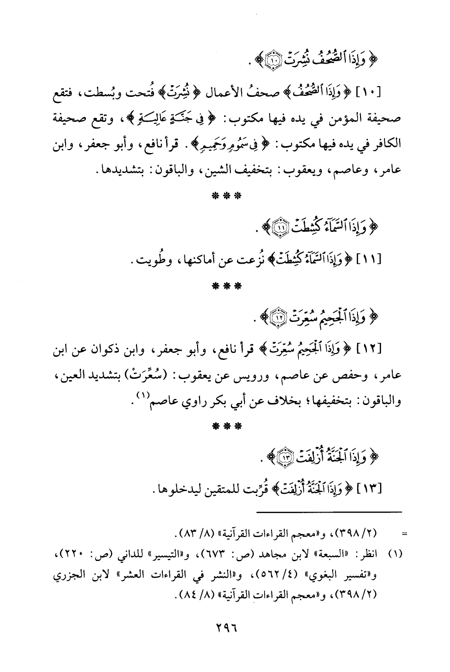 [10] {وَإِذَا الصُّحُفُ} صحفُ الأعمال {نُشِرَتْ} فُتحت وبُسطت، فتقع صحيفة المؤمن في يده فيها مكتوب: {فِي جَنَّةٍ عَالِيَةٍ}، وتقع صحيفة الكافر في يده فيها مكتوب: {فِي سَمُومٍ وَحَمِيمٍ}. قرأ نافع، وأبو جعفر، وابن عامر، وعاصم، ويعقوب: بتخفيف الشين، والباقون: بتشديدها.