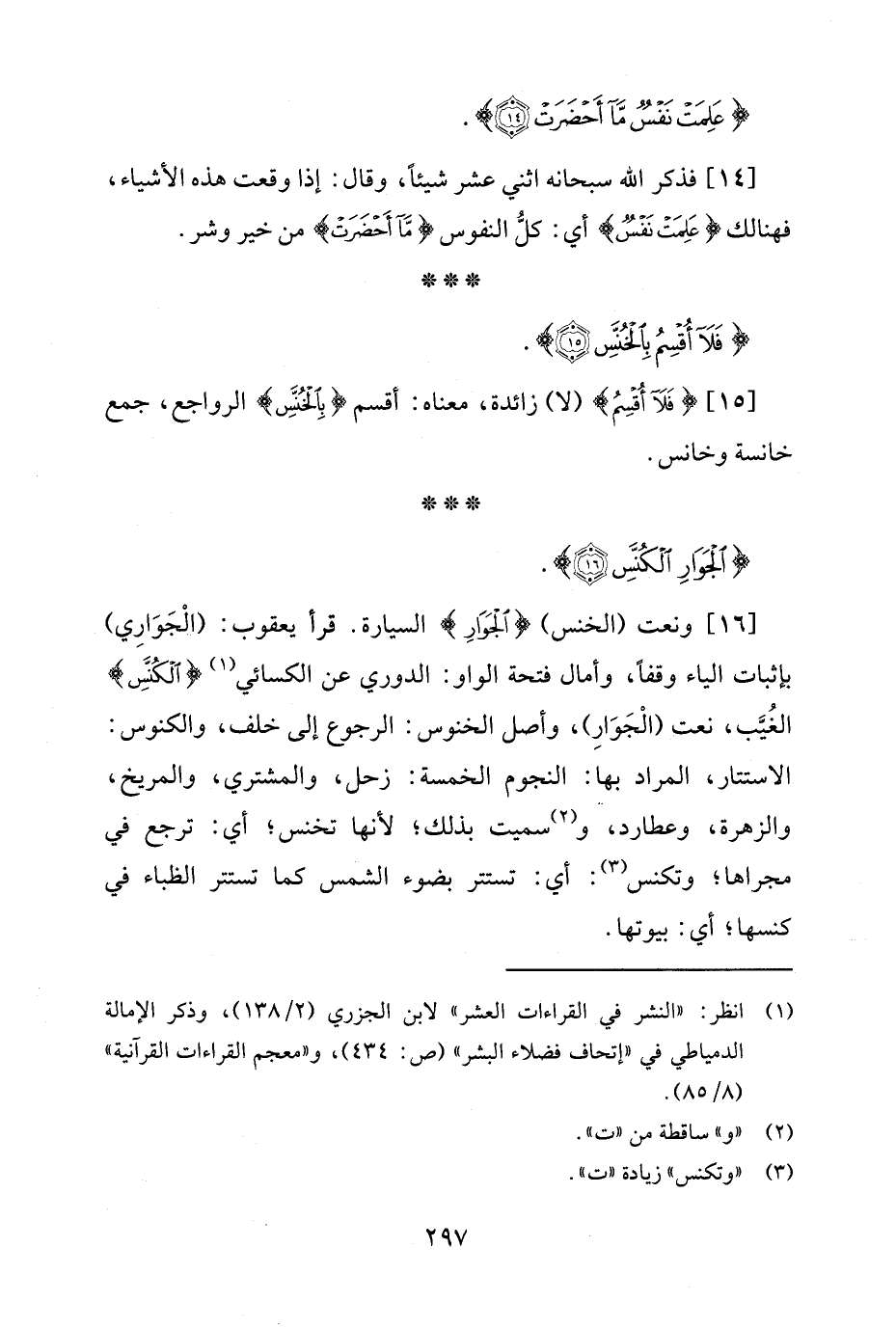 [15] {فَلَا أُقْسِمُ} (لا) زائدة، معناه: أقسم {بِالْخُنَّسِ} الرواجع، جمع خانسة وخانس.