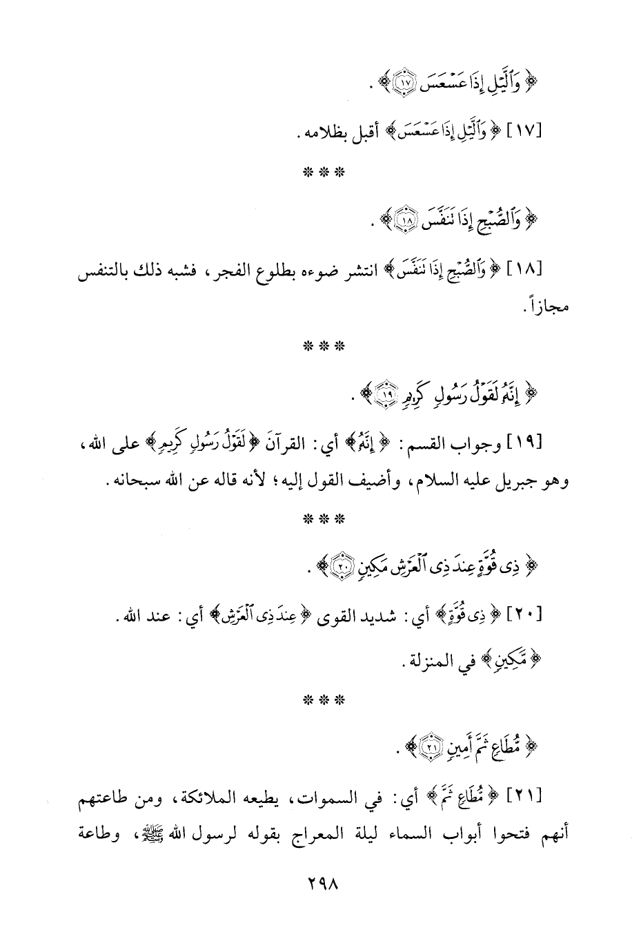 [21] {مُطَاعٍ ثَمَّ} أي: في السموات، يطيعه الملائكة، ومن طاعتهم أنهم فتحوا أبواب السماء ليلة المعراج بقوله لرسول الله - صلى الله عليه وسلم -، وطاعة