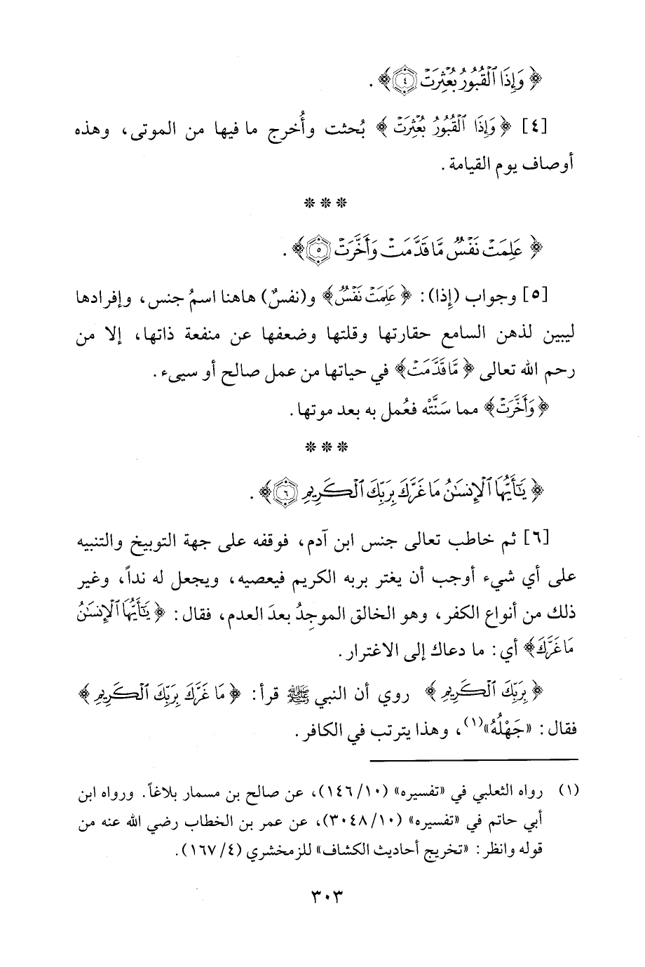 [4] {وَإِذَا الْقُبُورُ بُعْثِرَتْ} بُحثت وأُخرج ما فيها من الموتى، وهذه أوصاف يوم القيامة.