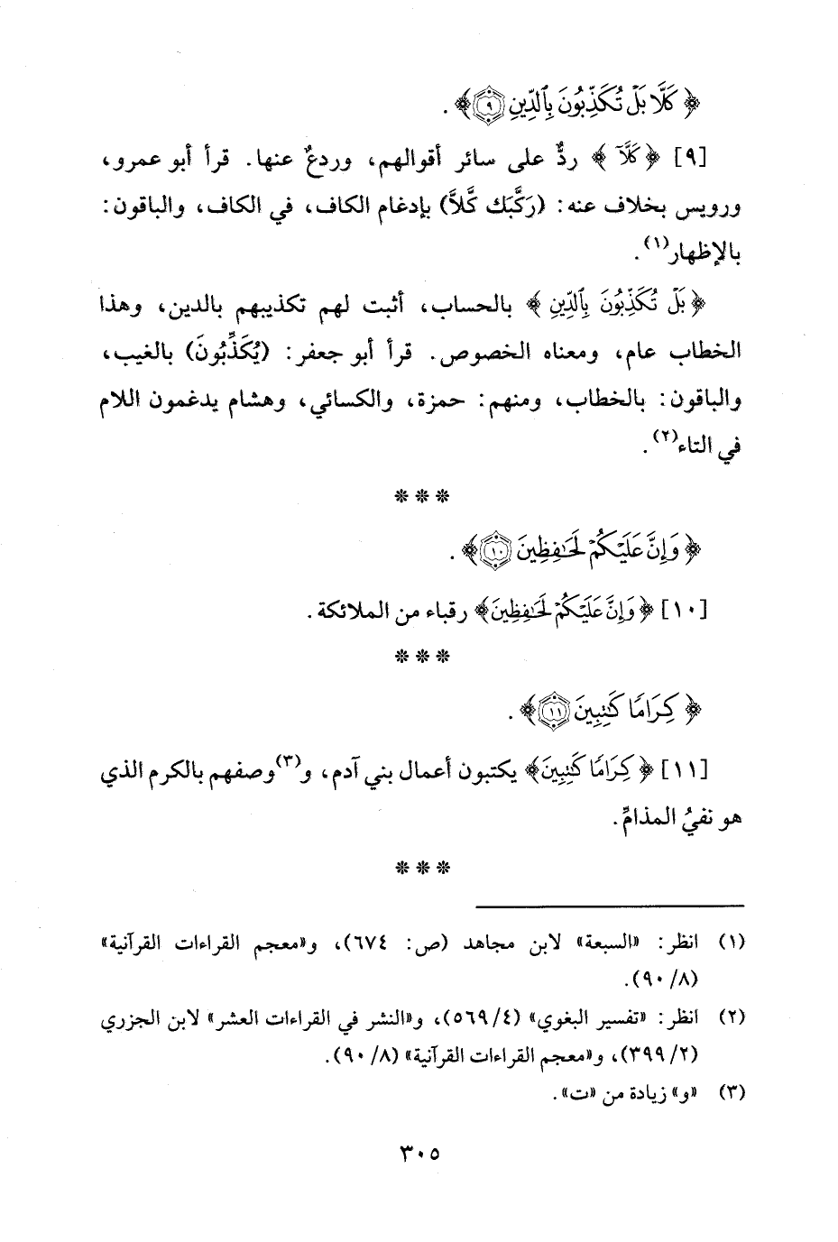 [11] {كِرَامًا كَاتِبِينَ} يكتبون أعمال بني آدم، و (¬3) وصفهم بالكرم الذي هو نفيُ المذامِّ.