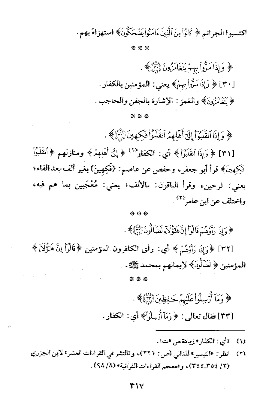 [31] {وَإِذَا انْقَلَبُوا} أى: الكفار (¬1) {إِلَى أَهْلِهِمُ} ومنازلهم {انْقَلَبُوا فَكِهِينَ} قرأ أبو جعفر، وحفص عن عاصم: (فَكِهِينَ) بغير ألف بعد الفاء؛ يعني: فرحين، وقرأ الباقون: بالألف؛ يعني: مُعجبين بما هم فيه، واختلف عن ابن عامر (¬2).