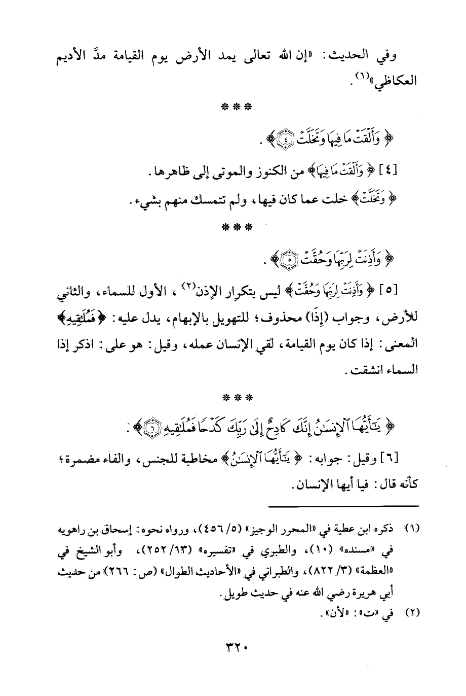 [5] {وَأَذِنَتْ لِرَبِّهَا وَحُقَّتْ} ليس بتكرار الإذن (¬2)، الأول للسماء، والثاني للأرض، وجواب (إِذَا) محذوف؛ للتهويل بالإبهام، يدل عليه: {فَمُلَاقِيهِ} المعنى: إذا كان يوم القيامة، لقي الإنسان عمله، وقيل: هو على: اذكر إذا السماء انشقت.