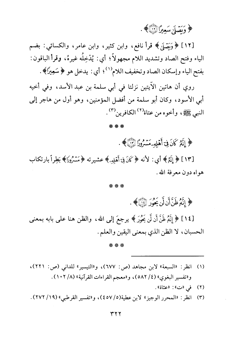 [14] {إِنَّهُ ظَنَّ أَنْ لَنْ يَحُورَ} يرجعَ إلى الله، والظن هنا على بابه بمعنى الحسبان، لا الظن الذي بمعنى اليقين والعلم.