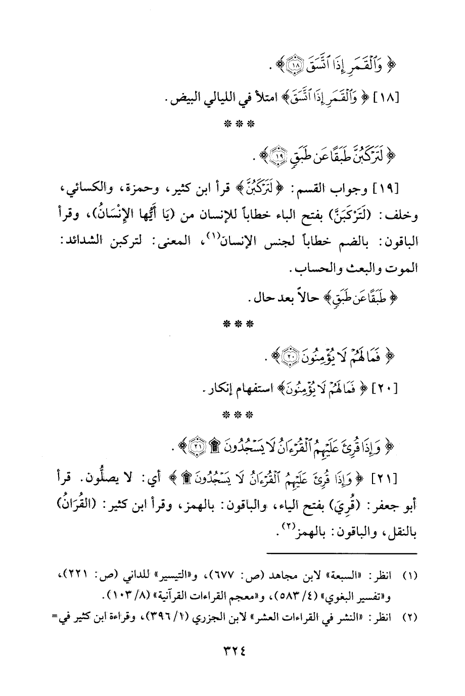 [19] وجواب القسم: {لَتَرْكَبُنَّ} قرأ ابن كثير، وحمزة، والكسائي، وخلف: (لَتَرْكَبَنَّ) بفتح الباء خطابًا للإنسان من (يَا أَيُّها الإِنْسَانُ)، وقرأ الباقون: بالضم خطابًا لجنس الإنسان (¬1) المعنى: لتركبن الشدائد: الموت والبعث والحساب.