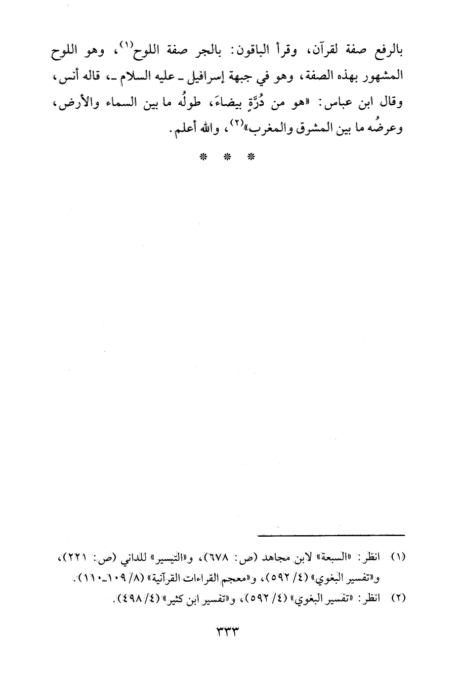 بالرفع صفة لقرآن، وقرأ الباقون: بالجر صفة اللوح (¬1)، وهو اللوح المشهور بهذه الصفة، وهو في جبهة إسرافيل -عليه السلام-، قاله أنس، وقال ابن عباس: "هو من دُرَّةٍ بيضاءَ، طولُه ما بين السماء والأرض، وعرضُه ما بين المشرق والمغرب" (¬2)، والله أعلم.