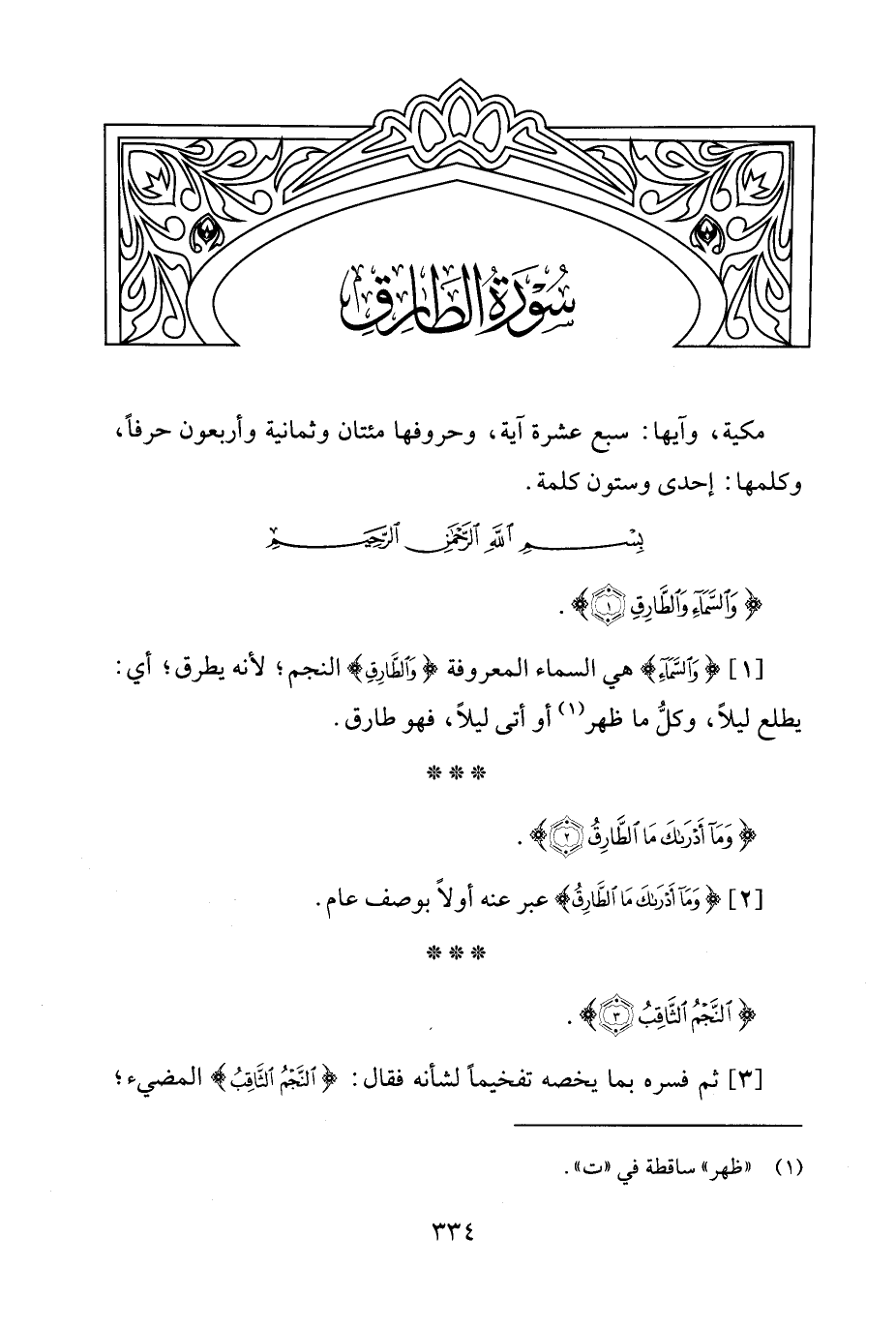 [1] {وَالسَّمَاءِ} هي السماء المعروفة {وَالطَّارِقِ} النجم؛ لأنه يطرق، أي: يطلع ليلًا، وكلُّ ما ظهر (¬1) أو أتى ليلًا، فهو طارق.