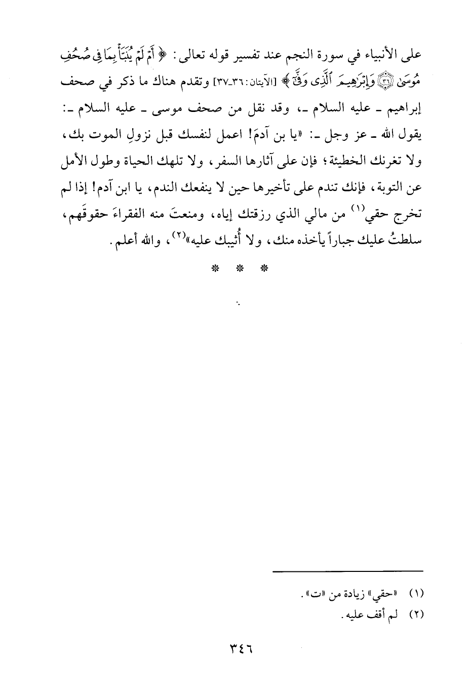 على الأنبياء في سورة النجم عند تفسير قوله تعالى: {أَمْ لَمْ يُنَبَّأْ بِمَا فِي صُحُفِ مُوسَى (36) وَإِبْرَاهِيمَ الَّذِي وَفَّى} [الآيتان: 36 - 37]، وتقدم هناك ما ذكر في صحف إبراهيم -عليه السلام-، وقد نقل من صحف موسى -عليه السلام-: يقول الله -عز وجل-: "يا بن آدمَ! اعمل لنفسك قبل نزولِ الموت بك، ولا تغرنك الخطيئة؛ فإن على آثارها السفر، ولا تلهك الحياة وطول الأصل عن التوبة، فإنك تندم على تأخيرها حين لا ينفعك الندم، يا ابن آدم! إذا لم تخرج حقي (¬1) من مالي الذي رزقتك إياه، ومنعتَ منه الفقراءَ حقوقَهم، سلطتُ عليك جبارًا يأخذه منك، ولا أُثيبك عليه" (¬2)، والله أعلم.