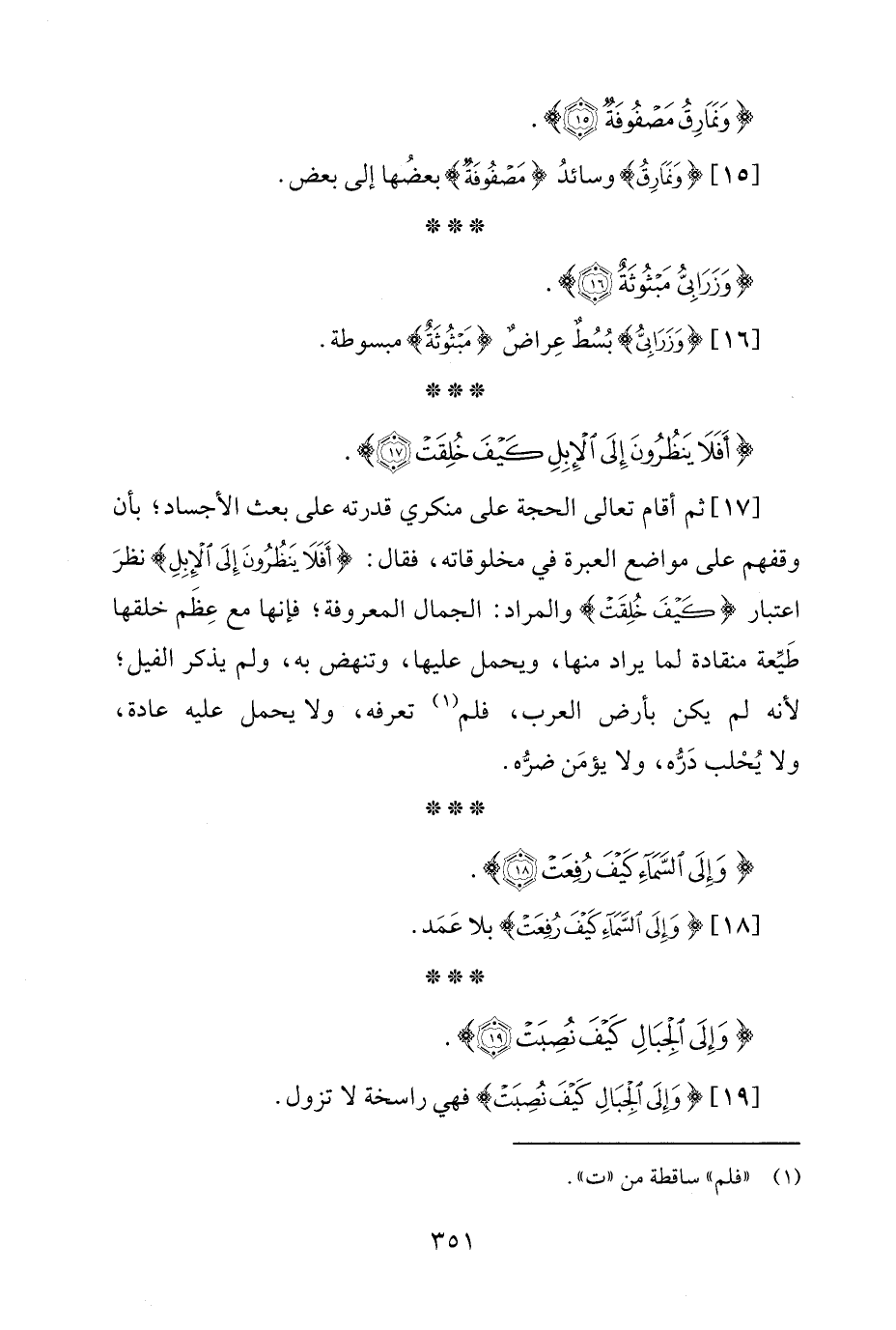 [17] ثم أقام تعالى الحجة على منكري قدرته على بعث الأجساد؛ بأن وقفهم على مواضع العبرة في مخلوقاته، فقال: {أَفَلَا يَنْظُرُونَ إِلَى الْإِبِلِ} نظرَ اعتبار {كَيْفَ خُلِقَتْ} والمراد: الجمال المعروفة؛ فإنها مع عِظَم خلقها طَيِّعة منقادة لما يراد منها، ويحمل عليها، وتنهض به، ولم يذكر الفيل؛ لأنه لم يكن بأرض العرب، فلم (¬1) تعرفه، ولا يحمل عليه عادة، ولا يُحْلب دَرُّه، ولا يؤمَن ضرُّه.