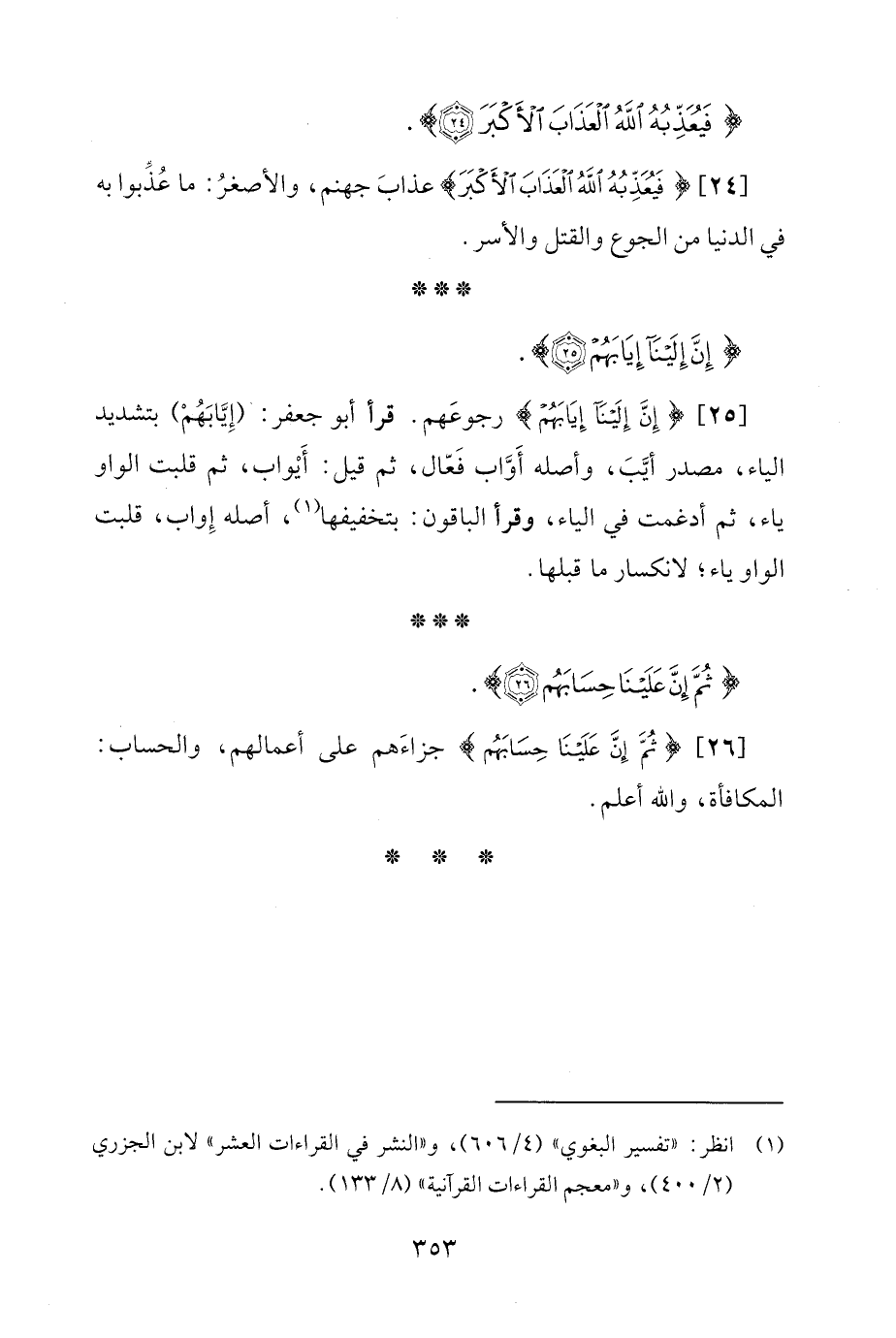 [25] {إِنَّ إِلَيْنَا إِيَابَهُمْ} رجوعَهم. قرأ أبو جعفر: (إِيَّابَهُمْ) بتشديد الياء، مصدر أيَّبَ، وأصله أَوَّاب فَعّال، ثم قيل: أَيْواب، ثم قلبت الواو ياء، ثم أدغمت في الياء، وقرأ الباقون: بتخفيفها (¬1)، أصله إِواب، قلبت الواو ياء؛ لانكسار ما قبلها.