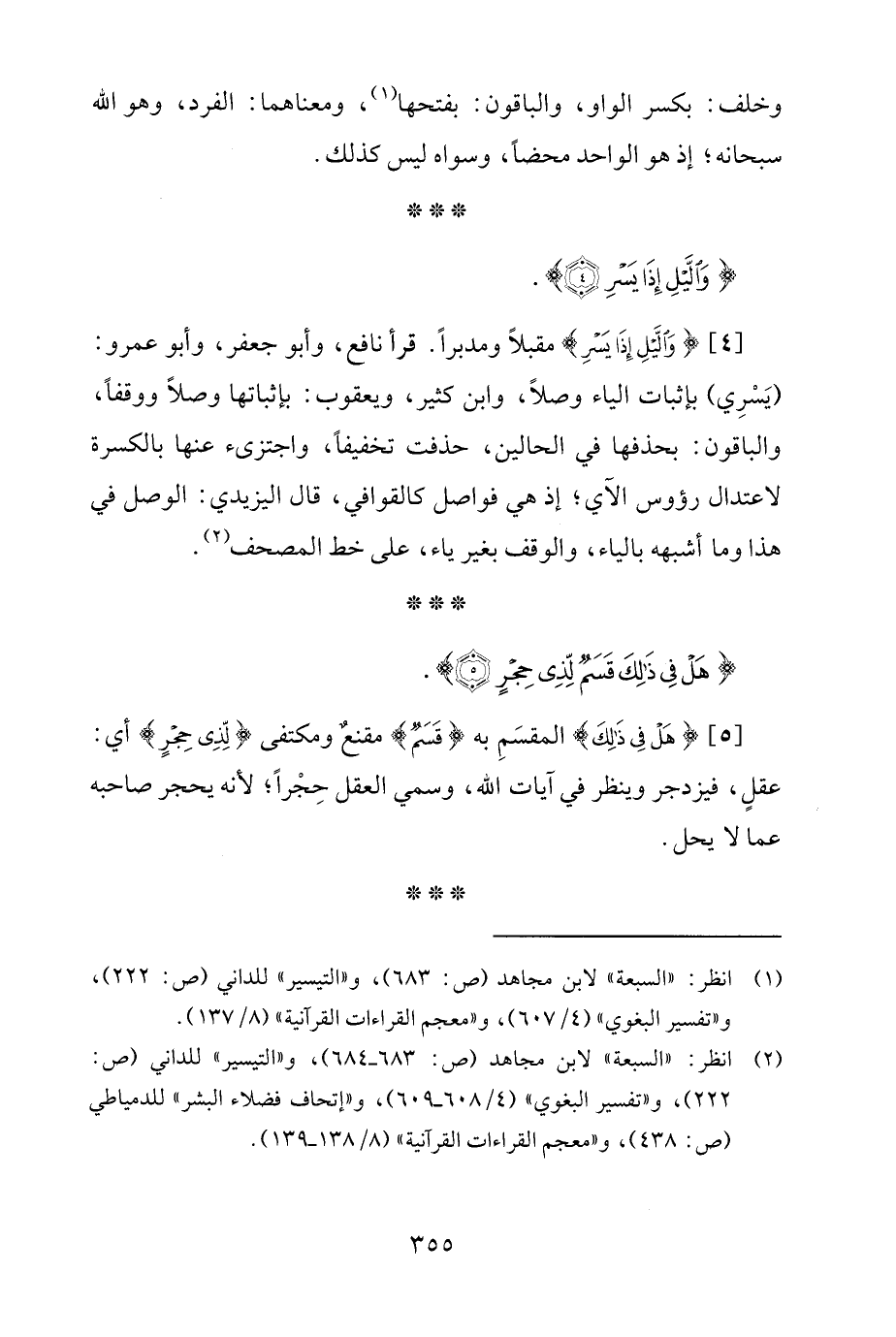 [4] {وَاللَّيْلِ إِذَا يَسْرِ} مقبلًا ومدبرًا. قرأ نافع، وأبو جعفر، وأبو عمرو: (يَسْرِي) بإثبات الياء وصلًا، وابن كثير، ويعقوب: بإثباتها وصلًا ووقفًا، والباقون: بحذفها في الحالين، حذفت تخفيفًا، واجتزئ عنها بالكسرة لاعتدال رؤوس الآي؛ إذ هي فواصل كالقوافي، قال اليزيدي: الوصل في هذا وما أشبهه بالياء، والوقف بغير ياء، على خط المصحف (¬2).