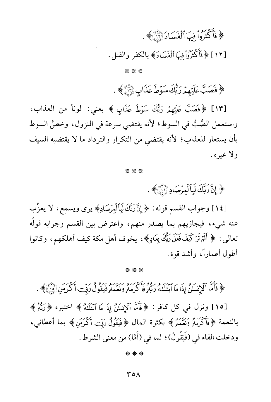 [13] {فَصَبَّ عَلَيْهِمْ رَبُّكَ سَوْطَ عَذَابٍ} يعني: لونًا من العذاب، واستعمل الصَّبُّ في السوط، لأنه يقتضي سرعة في النزول، وخصَّ السوط بأن يستعار للعذاب؛ لأنه يقتضي من التكرار والترداد ما لا يقتضيه السيف ولا غيره.