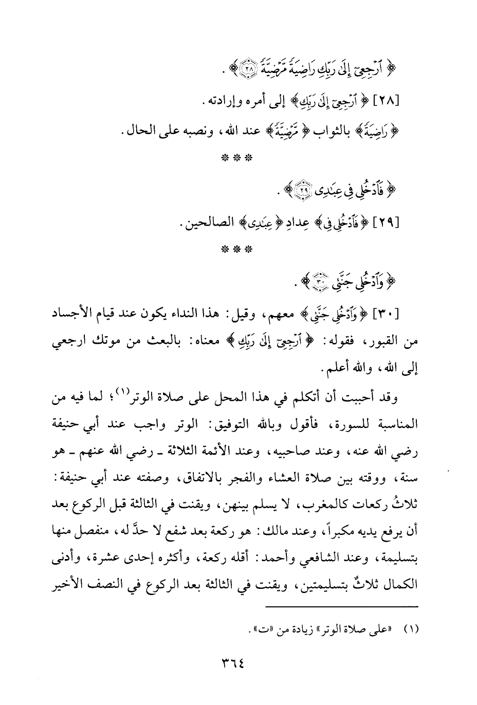 وقد أحببت أن أتكلم في هذا المحل على صلاة الوتر (¬1)؛ لما فيه من المناسبة للسورة، فأقول وبالله التوفيق: الوتر واجب عند أبي حنيفة رضي الله عنه، وعند صاحبيه، وعند الأئمة الثلاثة -رضي الله عنهم- هو سنة، ووقته بين صلاة العشاء والفجر بالاتفاق، وصفته عند أبي حنيفة: ثلاثُ ركعات كالمغرب، لا يسلم بينهن، ويقنت في الثالثة قبل الركوع بعد أن يرفع يديه مكبرًا، وعند مالك: هو ركعة بعد شفع لا حدَّ له، منفصل منها بتسليمة، وعند الشافعي وأحمد: أقله ركعة، وأكثره إحدى عشرة، وأدنى الكمال ثلاثٌ بتسليمتين، ويقنت في الثالثة بعد الركوع في النصف الأخير