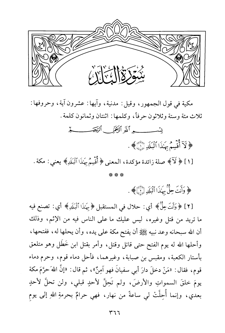 [2] {وَأَنْتَ حِلٌّ} أي: حلال في المستقبل {بِهَذَا الْبَلَدِ} أي: تصنع فيه ما تريد من قتل وغيره، ليس عليك ما على الناس فيه من الإثم، وذلك أن الله سبحانه وعد نبيه - صلى الله عليه وسلم - أن يفتح مكة على يده، وأن يحلها له، ففتحها، وأحلها الله له يوم الفتح حتى قاتل وقتل، وأمر بقتل ابن خَطَل وهو متلعق بأستار الكعبة، ومقبس بن صبابة، وغيرهما، فأحل دماء قوم، وحرم دماء قوم، فقال: "مَنْ دخلَ دارَ أبي سفيانَ فهو آمِنٌ"، ثم قال: "إنَّ اللهَ حرَّمَ مكة يومَ خلقَ السمواتِ والأرضَ، ولم تَحِلَّ لأحدٍ قبلي، ولن تحلَّ لأحدٍ بعدي، وإنما أُحِلَّتْ لي ساعةً من نهار، فهي حرامٌ بحرمةِ اللهِ إلى يومِ