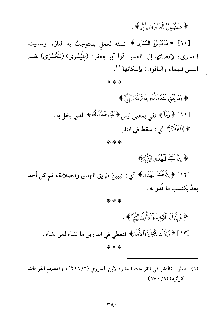 [10] {فَسَنُيَسِّرُهُ لِلْعُسْرَى} نهيئه لعملٍ يستوجبُ به النارَ، وسميت العسرى؛ لإفضائها إلى العسر. قرأ أبو جعفر: (لِلْيُسُرَى) (لِلْعُسُرَى) بضم السين فيهما، والباقون: بإسكانها (¬1).