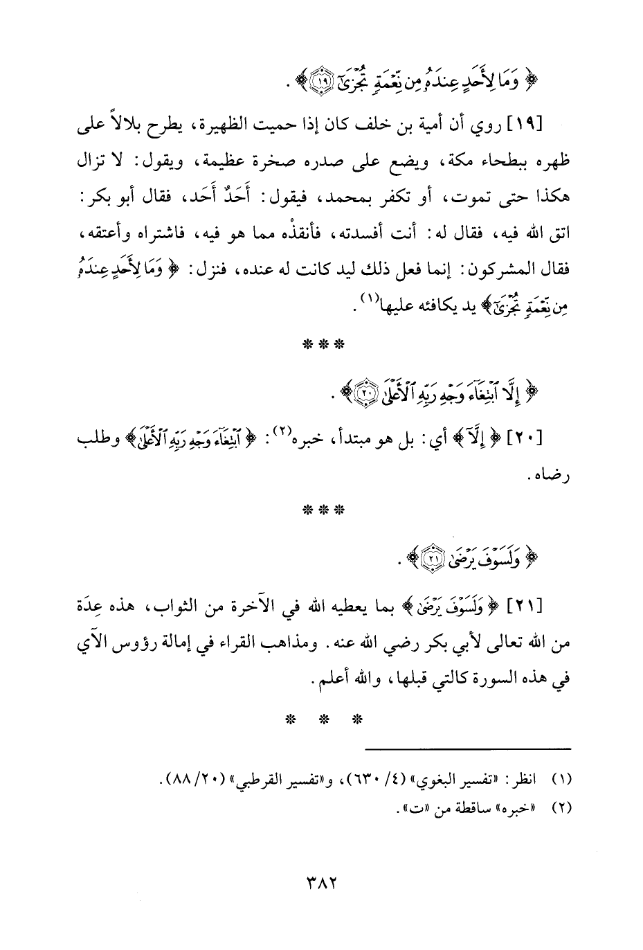 [19] روي أن أمية بن خلف كان إذا حميت الظهيرة، يطرح بلالًا على ظهره ببطحاء مكة، ويضع على صدره صخرة عظيمة، ويقول: لا تزال هكذا حتى تموت، أو تكفر بمحمد، فيقول: أَحَدٌ أَحَد، فقال أبو بكر: اتق الله فيه، فقال له: أنت أفسدته، فأنقذْه مما هو فيه، فاشتراه وأعتقه، فقال المشركون: إنما فعل ذلك ليد كانت له عنده، فنزل: {وَمَا لِأَحَدٍ عِنْدَهُ مِنْ نِعْمَةٍ تُجْزَى} يد يكافئه عليها (¬1).