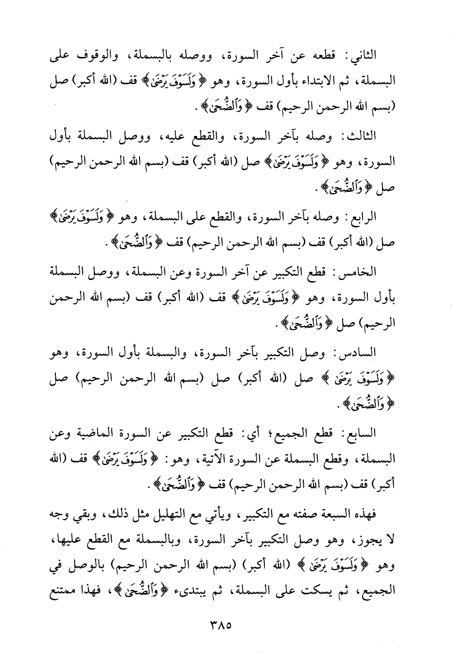 السابع: قطع الجميع؛ أي: قطع التكبير عن السورة الماضية وعن البسملة، وقطع البسملة عن السورة الآتية، وهو: {وَلَسَوْفَ يَرْضَى} قف (الله أكبر) قف (بِسْمِ اللَّهِ الرَّحْمَنِ الرَّحِيمِ) قف {وَالضُّحَى}.