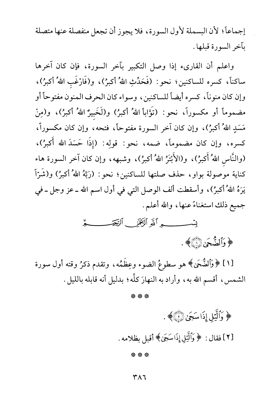 واعلم أن القارئ إذا وصل التكبير بآخر السورة، فإن كان آخرها ساكنًا، كسره للساكنين؛ نحو: (فَحَدِّثِ اللهُ أكبرُ)، و (فَارْغَبِ اللهُ أكبرُ)، وإن كان منونًا، كسره أيضًا للساكنين، وسواء كان الحرف المنون مفتوحًا أو مضمومًا أو مكسورًا، نحو: (تَوَّابًا اللهُ أكبرُ) و (لَخَبِيرٌ اللهُ أكبرُ)، و (مِنْ مَسَدٍ اللهُ أكبرُ)، وإن كان آخر السورة مفتوحًا، فتحه، وإن كان مكسورًا، كسره، وإن كان مضمومًا، ضمه، نحو: قولِه: (إِذَا حَسَدَ الله أَكبرُ)، (والنَّاسِ اللهُ أَكبرُ)، و (الأَبْتَرُ اللهُ أكبرُ)، وشبهه، وإن كان آخر السورة هاء كناية موصولة بواو، حذف صلتها للساكنين؛ نحو: (رَبَّهُ اللهُ أكبرُ) و (شَرًّا يَرَهُ اللهُ أكبرُ)، وأسقطت ألف الوصل التي في أول اسم الله -عز وجل- في جميع ذلك استغناءً عنها، والله أعلم.
