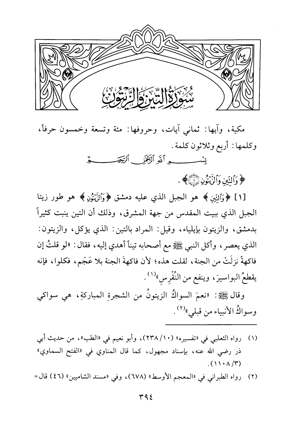[1] {وَالتِّينِ} هو الجبل الذي عليه دمشق {وَالزَّيْتُونِ} هو طور زيتا الجبل الذي ببيت المقدس من جهة المشرق، وذلك أن التين ينبت كثيرًا بدمشق، والزيتون بإيلياء، وقيل: المراد بالتين: الذي يؤكل، والزيتون: الذي يعصر، وأكل النبي - صلى الله عليه وسلم - مع أصحابه تينًا أهدي إليه، فقال: "لو قلتُ إن فاكهةً نزلَتْ من الجنة، لقلت هذه؛ لأن فاكهةَ الجنة بلا عَجَم، فكلوا، فإنه يقطعُ البواسيرَ، وينفع من النِّقْرِسِ" (¬1).