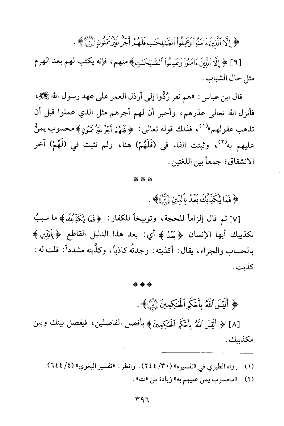 قال ابن عباس: "هم نفر رُدُّوا إلى أرذل العمر على عهد رسول الله - صلى الله عليه وسلم -، فأنزل الله تعالى عذرهم، وأخبر أن لهم أجرهم مثل الذي عملوا قبل أن تذهب عقولهم" (¬1)، فذلك قوله تعالى: {فَلَهُمْ أَجْرٌ غَيْرُ مَمْنُونٍ} محسوب يمنُّ عليهم به (¬2)، وثبتت الفاء في (فَلَهُمْ) هنا، ولم تثبت في (لَهُمْ) آخر الانشقاق؛ جمعًا بين اللغتين.