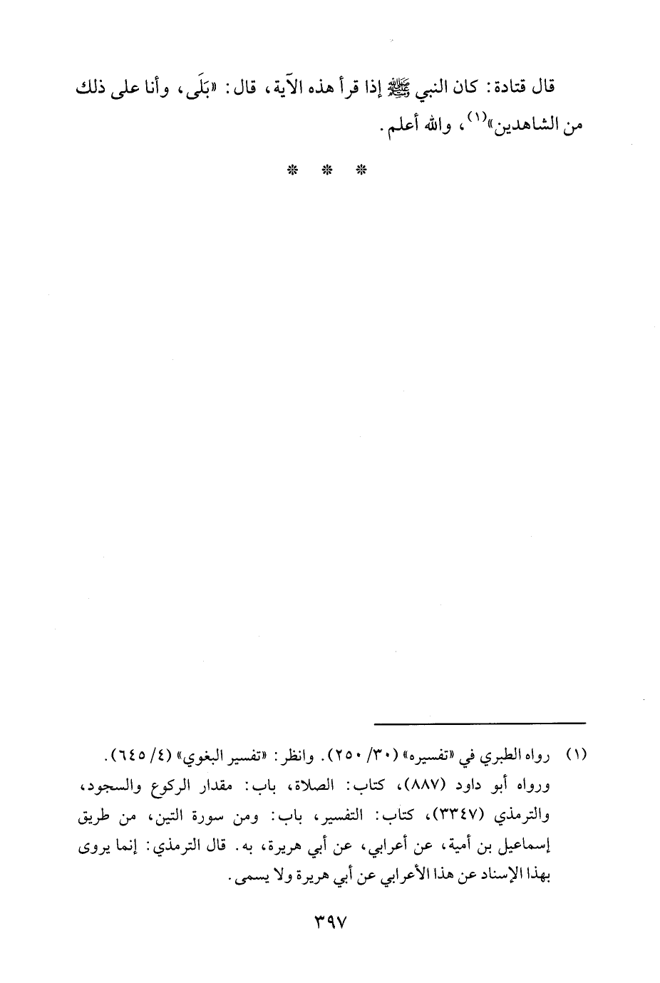 قال قتادة: كان النبي - صلى الله عليه وسلم - إذا قرأ هذه الآية، قال: "بَلَى، وأنا على ذلك من الشاهدين" (¬1)، والله أعلم.