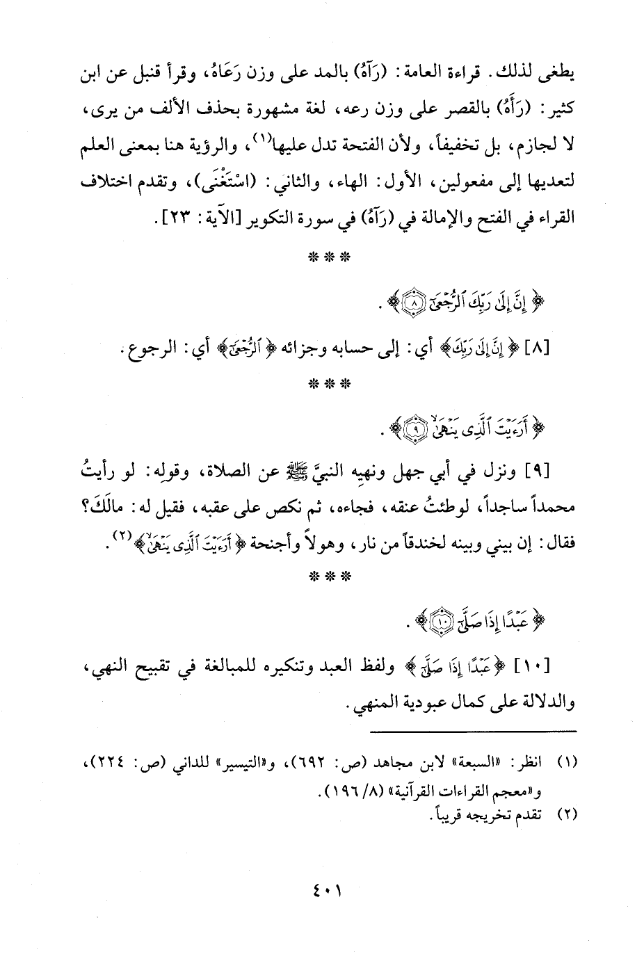[10] {عَبْدًا إِذَا صَلَّى} ولفظ العبد وتنكيره للمبالغة في تقبيح النهي، والدلالة على كمال عبودية المنهي.