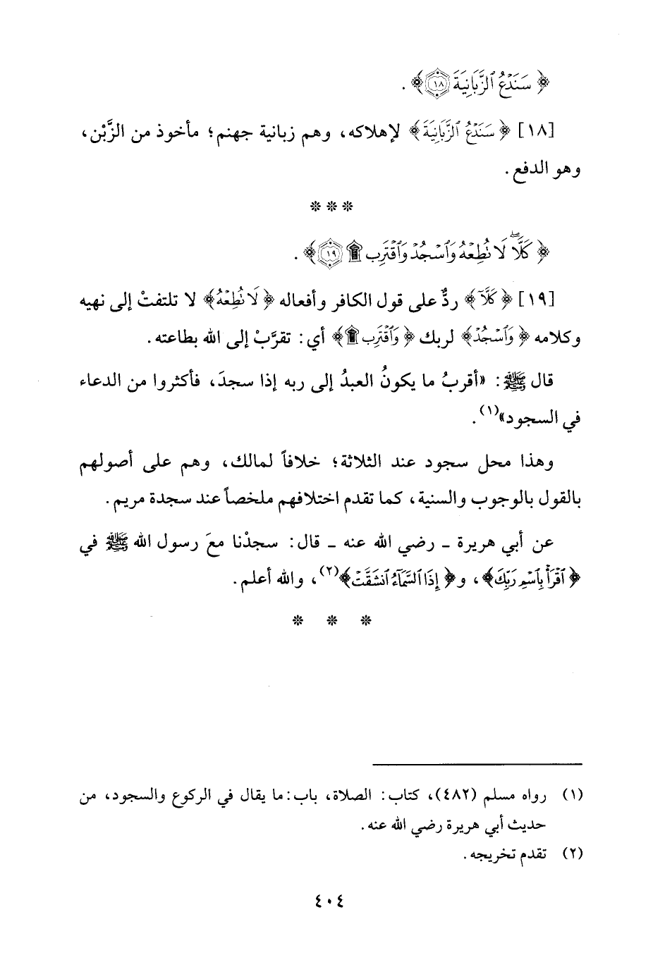 [18] {سَنَدْعُ الزَّبَانِيَةَ} لإهلاكه، وهم زبانية جهنم؛ مأخوذ من الزَّبْن، وهو الدفع.