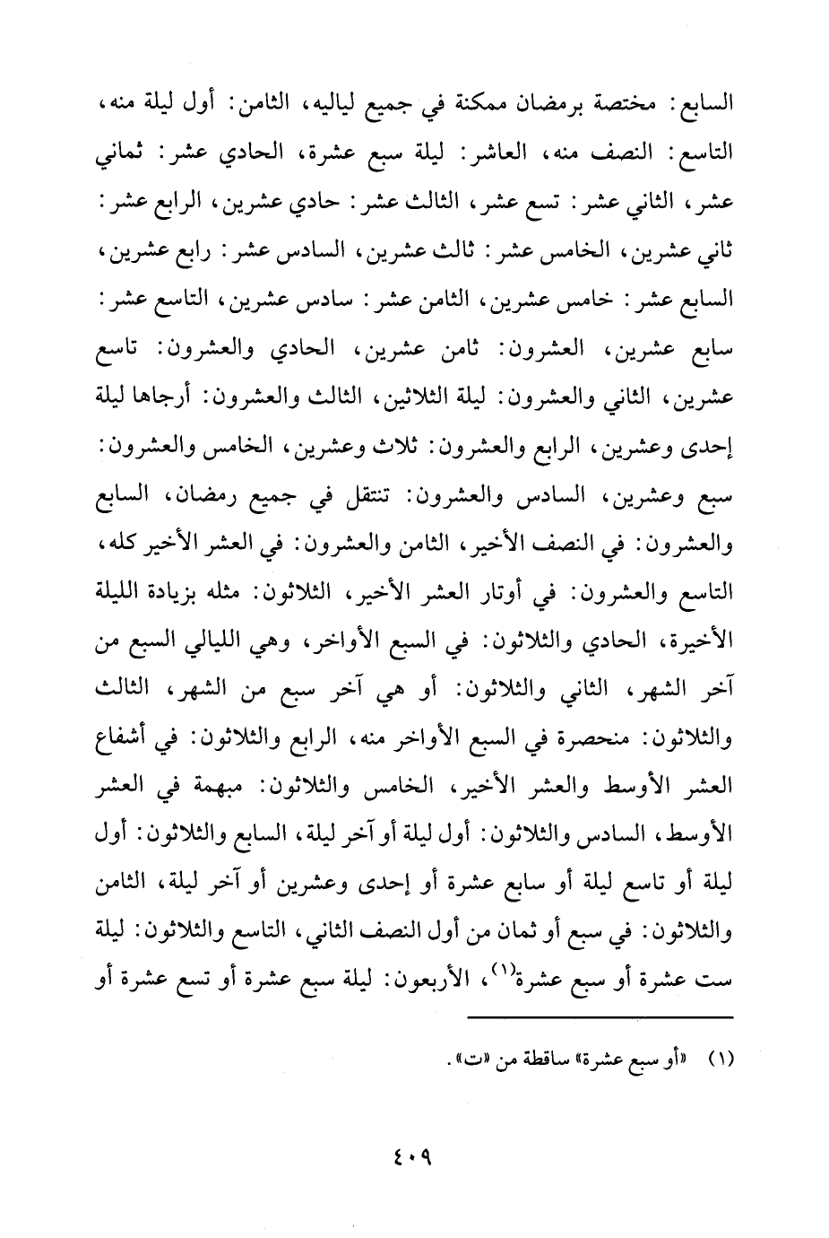 السابع: مختصة برمضان ممكنة في جميع لياليه، الثامن: أول ليلة منه، التاسع: النصف منه، العاشر: ليلة سبع عشرة، الحادي عشر: ثماني عشر، الثاني عشر: تسع عشر، الثالث عشر: حادي عشرين، الرابع عشر: ثاني عشرين، الخامس عشر: ثالث عشرين، السادس عشر: رابع عشرين، السابع عشر: خامس عشرين، الثامن عشر: سادس عشرين، التاسع عشر: سابع عشرين، العشرون: ثامن عشرين، الحادي والعشرون: تاسع عشرين، الثاني والعشرون: ليلة الثلاثين، الثالث والعشرون: أرجاها ليلة إحدى وعشرين، الرابع والعشرون: ثلاث وعشرين، الخامس والعشرون: سبع وعشرين، السادس والعشرون: تنتقل في جميع رمضان، السابع والعشرون: في النصف الأخير، الثامن والعشرون: في العشر الأخير كله، التاسع والعشرون: في أوتار العشر الأخير، الثلاثون: مثله بزيادة الليلة الأخيرة، الحادي والثلاثون: في السبع الأواخر، وهي الليالي السبع من آخر الشهر، الثاني والثلاثون: أو هي آخر سبع من الشهر، الثالث والثلاثون: منحصرة في السبع الأواخر منه، الرابع والثلاثون: في أشفاع العشر الأوسط والعشر الأخير، الخامس والثلاثون: مبهمة في العشر الأوسط، السادس والثلاثون: أول ليلة أو آخر ليلة، السابع والثلاثون: أول ليلة أو تاسع ليلة أو سابع عشرة أو إحدى وعشرين أو آخر ليلة، الثامن والثلاثون: في سبع أو ثمان من أول النصف الثاني، التاسع والثلاثون: ليلة ست عشرة أو سبع عشرة (¬1)، الأربعون: ليلة سبع عشرة أو تسع عشرة أو