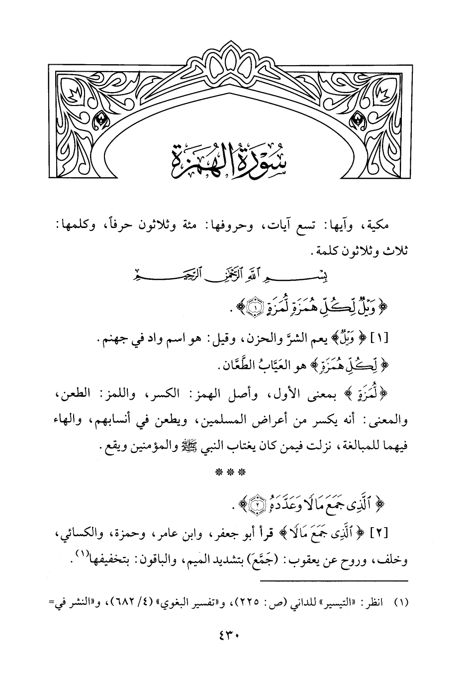 {لُمَزَةٍ} بمعنى الأوّل، وأصل الهمز: الكسر، واللمز: الطعن، والمعنى: أنّه يكسر من أعراض المسلمين، ويطعن في أنسابهم، والهاء فيهما للمبالغة، نزلت فيمن كان يغتاب النّبيّ - صلى الله عليه وسلم - والمؤمنين ويقع.