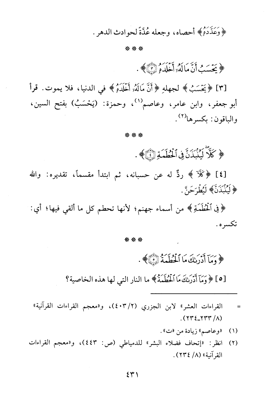 [3] {يَحْسَبُ} لجهلهِ {أَنَّ مَالَهُ أَخْلَدَهُ} في الدنيا، فلا يموت. قرأ أبو جعفر، وابن عامر، وعاصم (¬1)، وحمزة: (يَحْسَبُ) بفتح السين، والباقون: بكسرها (¬2).