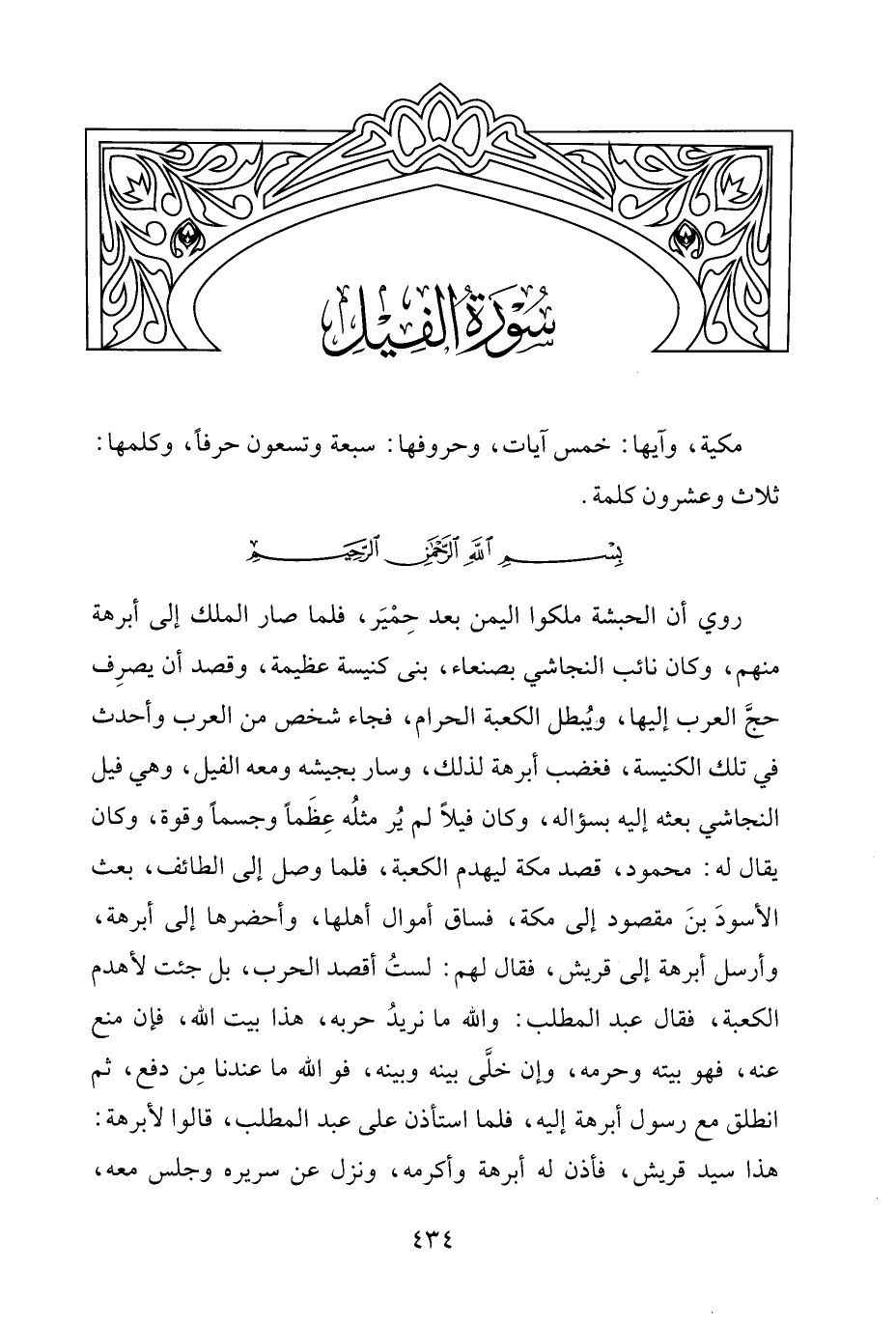 روي أن الحبشة ملكوا اليمن بعد حِمْيَر، فلما صار الملك إلى أبرهة منهم، وكان نائب النجاشي بصنعاء، بنى كنيسة عظيمة، وقصد أن يصرِف حجَّ العرب إليها، ويُبطل الكعبة الحرام، فجاء شخص من العرب وأحدث في تلك الكنيسة، فغضب أبرهة لذلك، وسار بجيشه ومعه الفيل، وهي فيل النجاشي بعثه إليه بسؤاله، وكان فيلًا لم يُر مثلُه عِظَمًا وجسمًا وقوة، وكان يقال له: محمود، قصد مكّة ليهدم الكعبة، فلما وصل إلى الطائف، بعث الأسودَ بنَ مقصود إلى مكّة، فساق أموال أهلها، وأحضرها إلى أبرهة، وأرسل أبرهة إلى قريش، فقال لهم: لستُ أقصد الحرب، بل جئت لأهدم الكعبة، فقال عبد المطلب: والله ما نريدُ حربه، هذا بيت الله، فإن منع عنه، فهو بيته وحرمه، وإن خلَّى بينه وبينه، فو الله ما عندنا مِن دفع، ثمّ انطلق مع رسول أبرهة إليه، فلما استأذن على عبد المطلب، قالوا لأبرهة: هذا سيد قريش، فأذن له أبرهة وأكرمه، ونزل عن سريره وجلس معه،