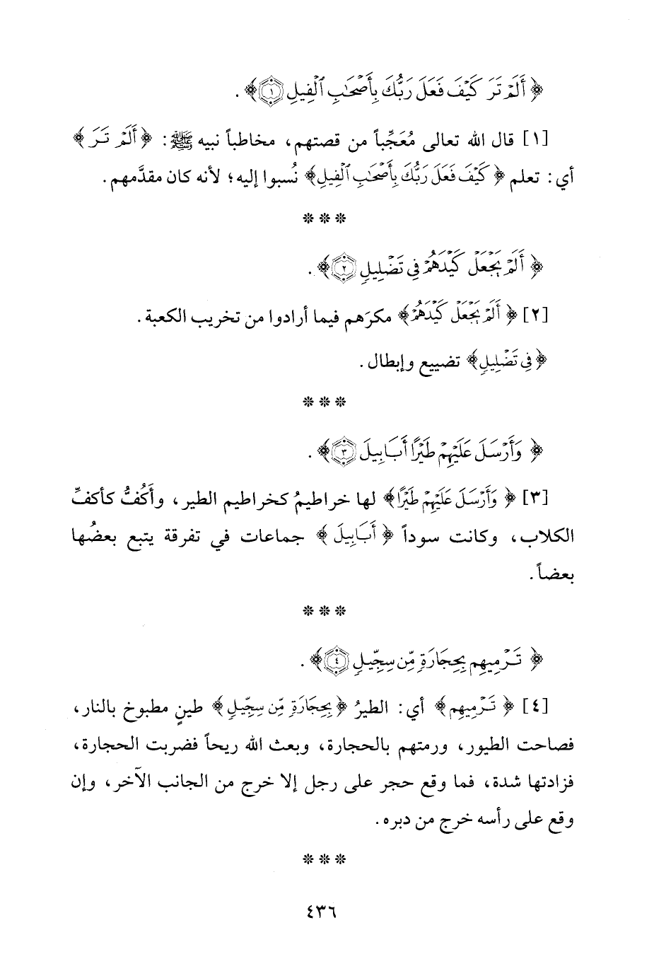 [1] قال الله تعالى مُعَجِّبًا من قصتهم، مخاطبًا نبيه - صلى الله عليه وسلم -: {أَلَمْ تَرَ} أي: تعلم {كَيْفَ فَعَلَ رَبُّكَ بِأَصْحَابِ الْفِيلِ} نُسبوا إليه؛ لأنه كان مقدَّمهم.