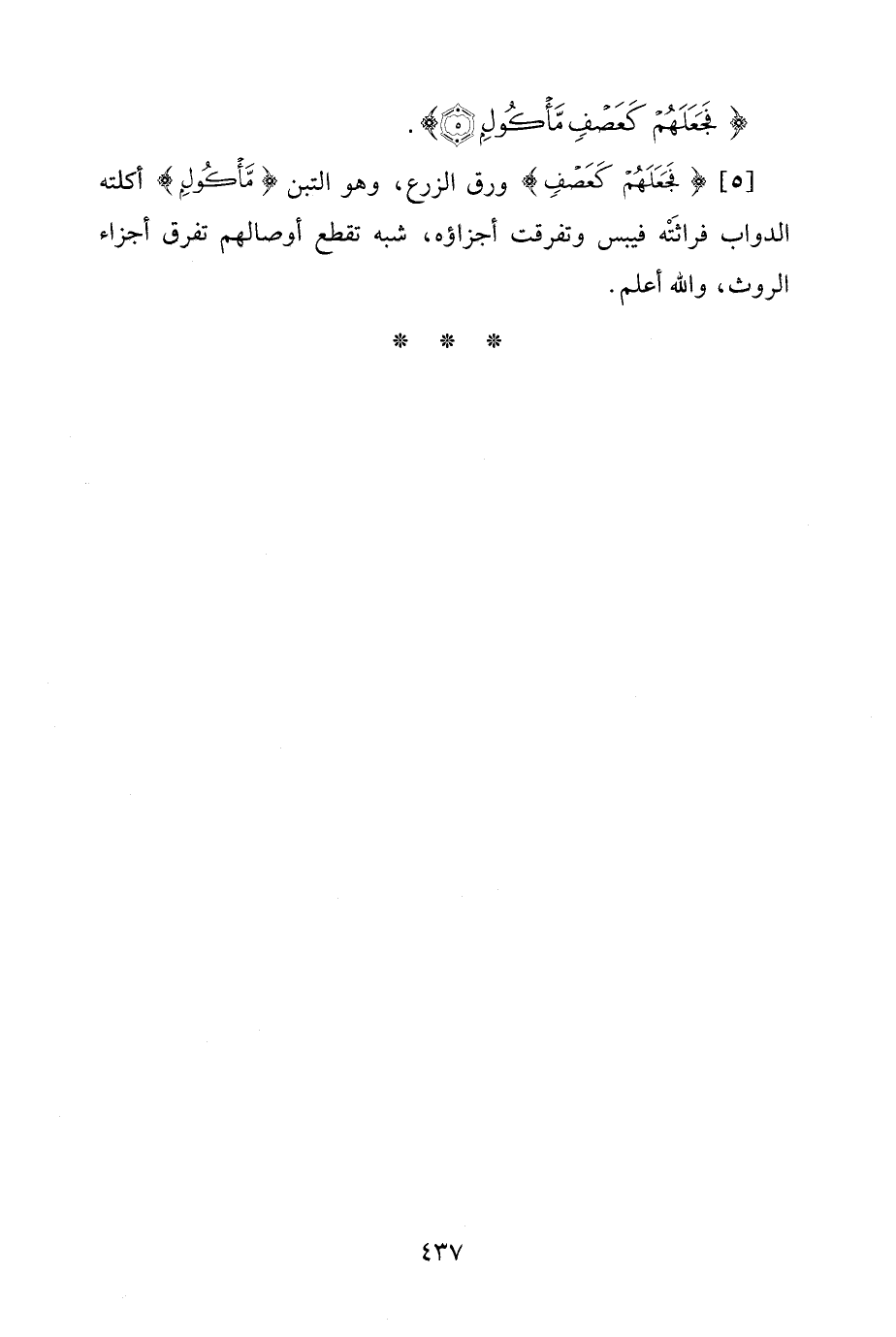 [5] {فَجَعَلَهُمْ كَعَصْفٍ} ورق الزرع، وهو التبن {مَأْكُولٍ} أكلته الدواب فراثَتْه فيبس وتفرقت أجزاؤه، شبه تقطع أوصالهم تفرق أجزاء الروث، والله أعلم.