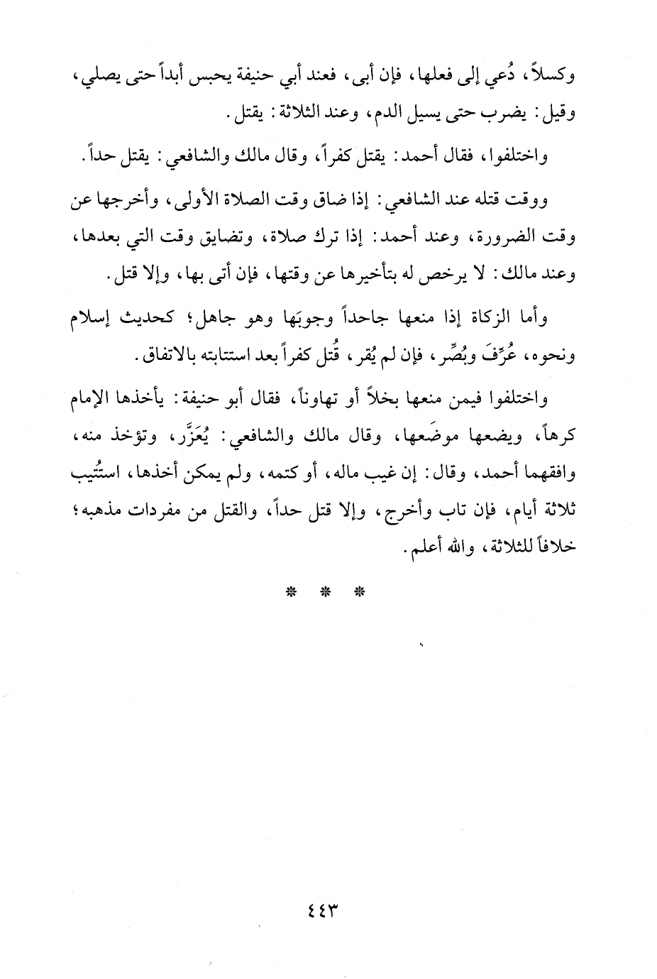 واختلفوا فيمن منعها بخلًا أو تهاونًا، فقال أبو حنيفة: يأخذها الإمام كرهًا، ويضعها موضَعها، وقال مالك والشّافعيّ: يُعَزَّر، وتؤخذ منه، وافقهما أحمد، وقال: إنَّ غيب ماله، أو كتمه، ولم يمكن أخذها، استُتيب ثلاثة أيّام، فإن تاب وأخرج، وإلا قتل حدًّا، والقتل من مفردات مذهبه؛ خلافًا للثلاثة، والله أعلم.