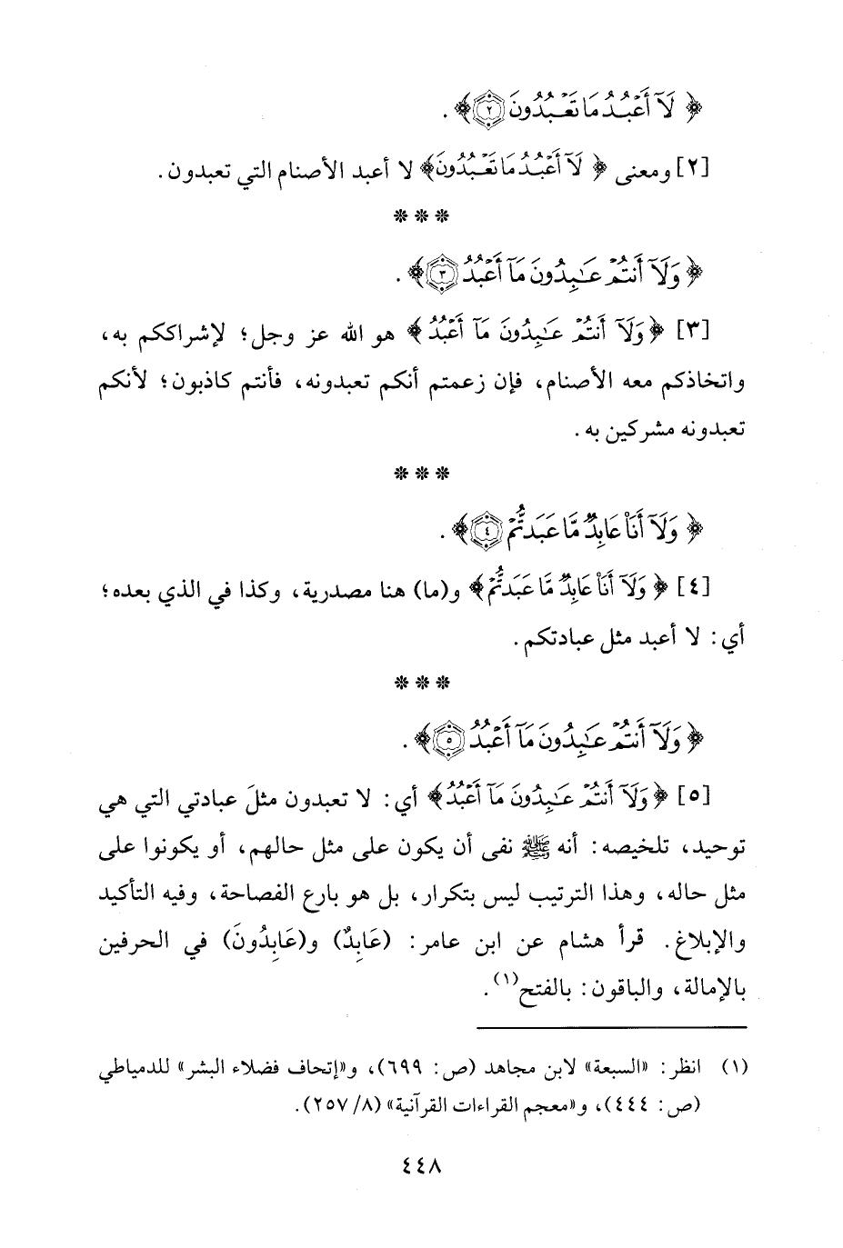 [5] {وَلَا أَنْتُمْ عَابِدُونَ مَا أَعْبُدُ} أي: لا تعبدون مثلَ عبادتي الّتي هي توحيد، تلخيصه: أنّه - صلى الله عليه وسلم - نفى أن يكون على مثل حالهم، أو يكونوا على مثل حاله، وهذا التّرتيب ليس بتكرار، بل هو بارع الفصاحة، وفيه التأكيد والإبلاغ. قرأ هشام عن ابن عامر: (عَابِدٌ) و (عَابِدُونَ) في الحرفين بالإمالة، والباقون: بالفتح (¬1).