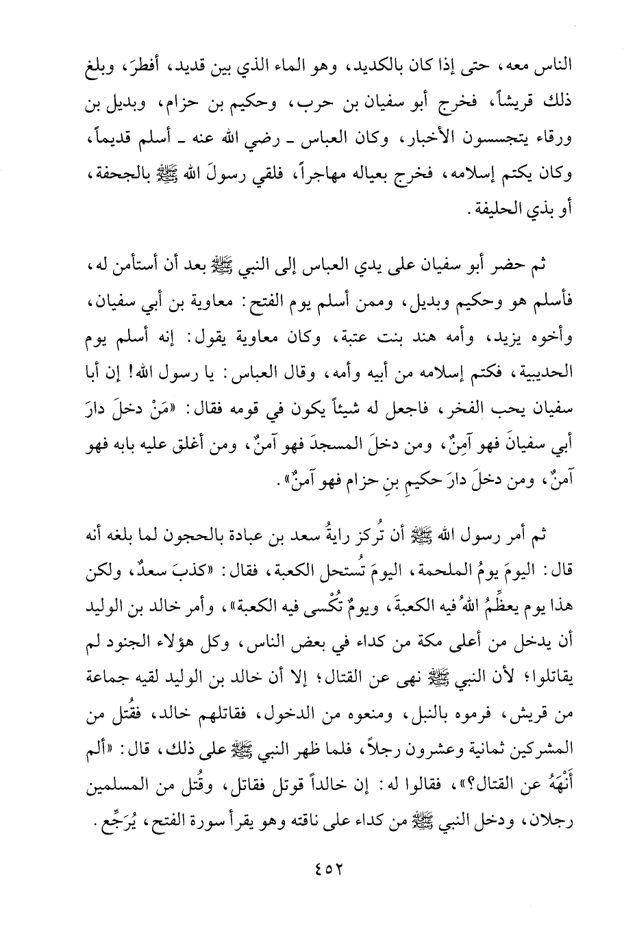 ثمّ أمر رسول الله - صلى الله عليه وسلم - أن تُركز رايةُ سعد بن عبادة بالحجون لما بلغه أنّه قال: اليومَ يومُ الملحمة، اليومَ تُستحل الكعبة، فقال: "كذبَ سعدٌ، ولكن هذا يوم يعظِّمُ اللهُ فيه الكعبةَ، ويومٌ تُكْسى فيه الكعبة"، وأمر خالد بن الوليد أن يدخل من أعلى مكّة من كداء في بعض النَّاس، وكل هؤلاء الجنود لم يقاتلوا؛ لأنّ النّبيّ - صلى الله عليه وسلم - نهى عن القتال؛ إِلَّا أن خالد بن الوليد لقيه جماعة من قريش، فرموه بالنبل، ومنعوه من الدخول، فقاتلهم خالد، فقُتل من المشركين ثمانية وعشرون رجلًا، فلما ظهر النّبيّ - صلى الله عليه وسلم - على ذلك، قال: "ألم أَنْهَهُ عن القتال؟ "، فقالوا له: إنَّ خالدًا قوتل فقاتل، وقُتل من المسلمين رجلان، ودخل النّبيّ - صلى الله عليه وسلم - من كداء على ناقته وهو يقرأ سورة الفتح، يُرَجِّع.