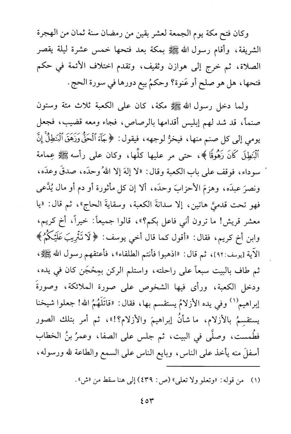 ولما دخل رسول الله - صلى الله عليه وسلم - مكّة، كان على الكعبة ثلاث مئة وستون صنمًا، قد شد لهم إبليس أقدامها بالرصاص، فجاء ومعه قضيب، فجعل يومي إلى كلّ صنم منها، فيخرُّ لوجهه، فيقول: {وَقُلْ جَاءَ الْحَقُّ وَزَهَقَ الْبَاطِلُ إِنَّ الْبَاطِلَ كَانَ زَهُوقًا}، حتّى مر عليها كلِّها، وكان على رأسه - صلى الله عليه وسلم - عِمامة سوداء، فوقف على باب الكعبة وقال: "لا إلهَ إِلَّا اللهُ وحدَه، صدقَ وعدَه، ونصرَ عبدَه، وهزمَ الأحزابَ وحدَه، ألَّا إنَّ كلّ مأثورة أو دم أو مال يُدَّعى فهو تحت قدميَّ هاتين، إِلَّا سدانةَ الكعبة، وسقايةَ الحاج"، ثمّ قال: "يا معشر قريش! ما ترون أني فاعل بكم؟ "، قالوا جميعًا: خيرًا، أخ كريم، وابن أخ كريم، فقال: "أقول كما قال أخي يوسف: {لَا تَثْرِيبَ عَلَيْكُمُ} الآية [يوسف: 92]، ثمّ قال: "اذهبوا فأنتم الطلقاء"، فأعتقهم رسول الله - صلى الله عليه وسلم -، ثمّ طاف بالبيت سبعًا على راحلته، واستلم الركن بمِحْجَن كان في يده، ودخل الكعبة، ورأى فيها الشخوص على سورة الملائكة، وصورةَ إبراهيم (¬1) وفي يده الأزلامُ يستقسم بها، فقال: "قاتَلَهُمُ الله! جعلوا شيخنا يستقسِمُ بالأزلام، ما شأنُ إبراهيمَ والأزلام؟! "، ثمّ أمر بتلك الصور فطُمست، وصلَّى في البيت، ثمّ جلس على الصفا، وعمرُ بنُ الخطّاب أسفلَ منه يأخذ على النَّاس، وبات النَّاس على السمع والطاعة لله ورسوله،