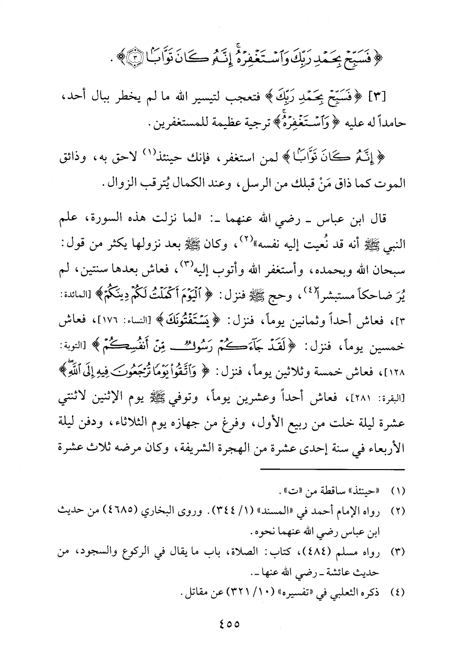 قال ابن عبّاس -رضي الله عنهما-: "لما نزلت هذه السورة، علم النّبيّ - صلى الله عليه وسلم - أنّه قد نُعيت إليه نفسه" (¬2)، وكان - صلى الله عليه وسلم - بعد نزولها يكثر من قول: سبحان الله وبحمده، وأستغفر الله وأتوب إليه (¬3)، فعاش بعدها سنتين، لم يُرَ ضاحكًا مستبشرًا (¬4)، وحج - صلى الله عليه وسلم - فنزل: {الْيَوْمَ أَكْمَلْتُ لَكُمْ دِينَكُمْ} [المائدة: 3]، فعاش أحدًا وثمانين يومًا، فنزل: {يَسْتَفْتُونَكَ} [النساء: 176]، فعاش خمسين يومًا، فنزل: {لَقَدْ جَاءَكُمْ رَسُولٌ مِنْ أَنْفُسِكُمْ} [التوبة: 128]، فعاش خمسة وثلاثين يومًا، فنزل: {وَاتَّقُوا يَوْمًا تُرْجَعُونَ فِيهِ إِلَى اللَّهِ} [البقرة: 281]، فعاش أحدًا وعشرين يومًا، وتوفي - صلى الله عليه وسلم - يوم الإثنين لاثنتي عشرة ليلة خلت من ربيع الأوّل، وفرغ من جهازه يوم الثلاثاء، ودفن ليلة الأربعاء في سنة إحدى عشرة من الهجرة الشريفة، وكان مرضه ثلاث عشرة