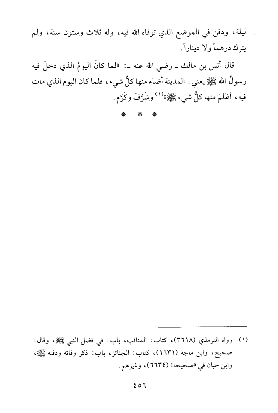قال أنس بن مالك -رضي الله عنه-: "لما كانَ اليومُ الّذي دخلَ فيه رسولُ الله - صلى الله عليه وسلم - يعني: المدينة أضاء منها كلُّ شيء، فلما كان اليوم الّذي مات فيه، أظلمَ منها كلُّ شيء - صلى الله عليه وسلم -" (¬1) وشَرَّفَ وكَرَّم.