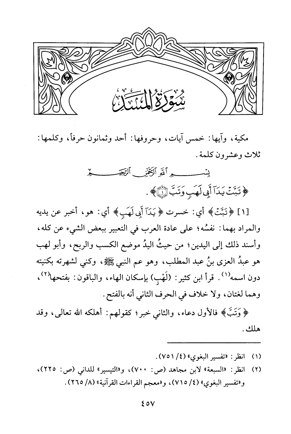 [1] {تَبَّتْ} أي: خسرت {يَدَا أَبِي لَهَبٍ} أي: هو، أخبر عن يديه والمراد بهما: نفسُه؛ على عادة العرب في التعبير ببعض الشيء عن كله، وأسند ذلك إلى اليدين؛ من حيثُ اليدُ موضع الكسب والربح، وأبو لهب هو عبدُ العزى بنُ عبد المطلب، وهو عم النّبيّ - صلى الله عليه وسلم -، وكني لشهرته بكنيته دون اسمه (¬1). قرأ ابن كثير: (لَهْبٍ) بإسكان الهاء، والباقون: بفتحها (¬2)، وهما لغتان، ولا خلاف في الحرف الثّاني أنّه بالفتح.