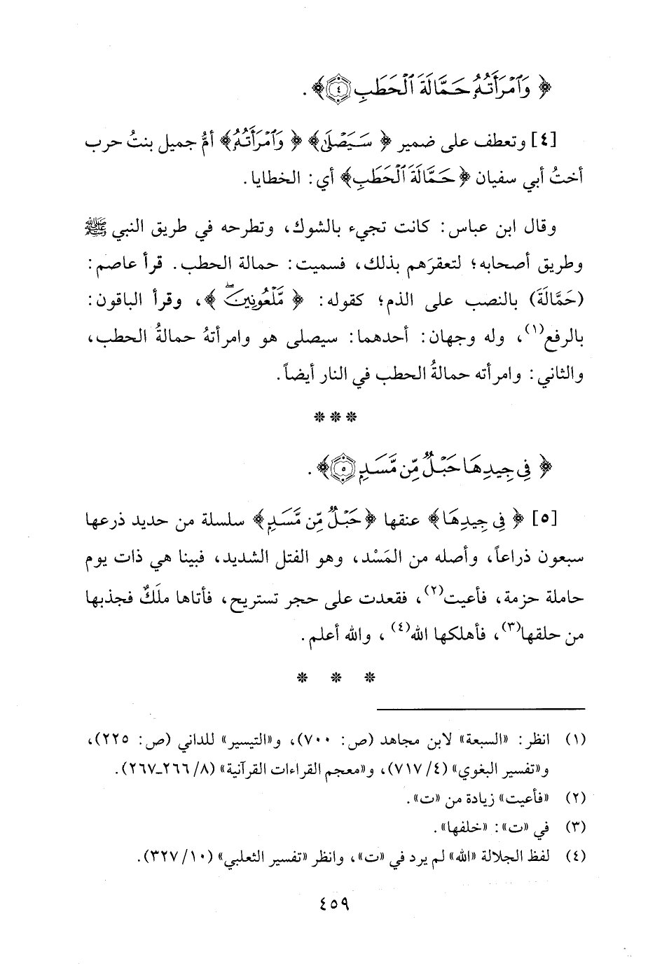 [4] وتعطف على ضمير {سَيَصْلَى} {وَامْرَأَتُهُ} أمُّ جميل بنتُ حرب أختُ أبي سفيان {حَمَّالَةَ الْحَطَبِ} أي: الخطايا.