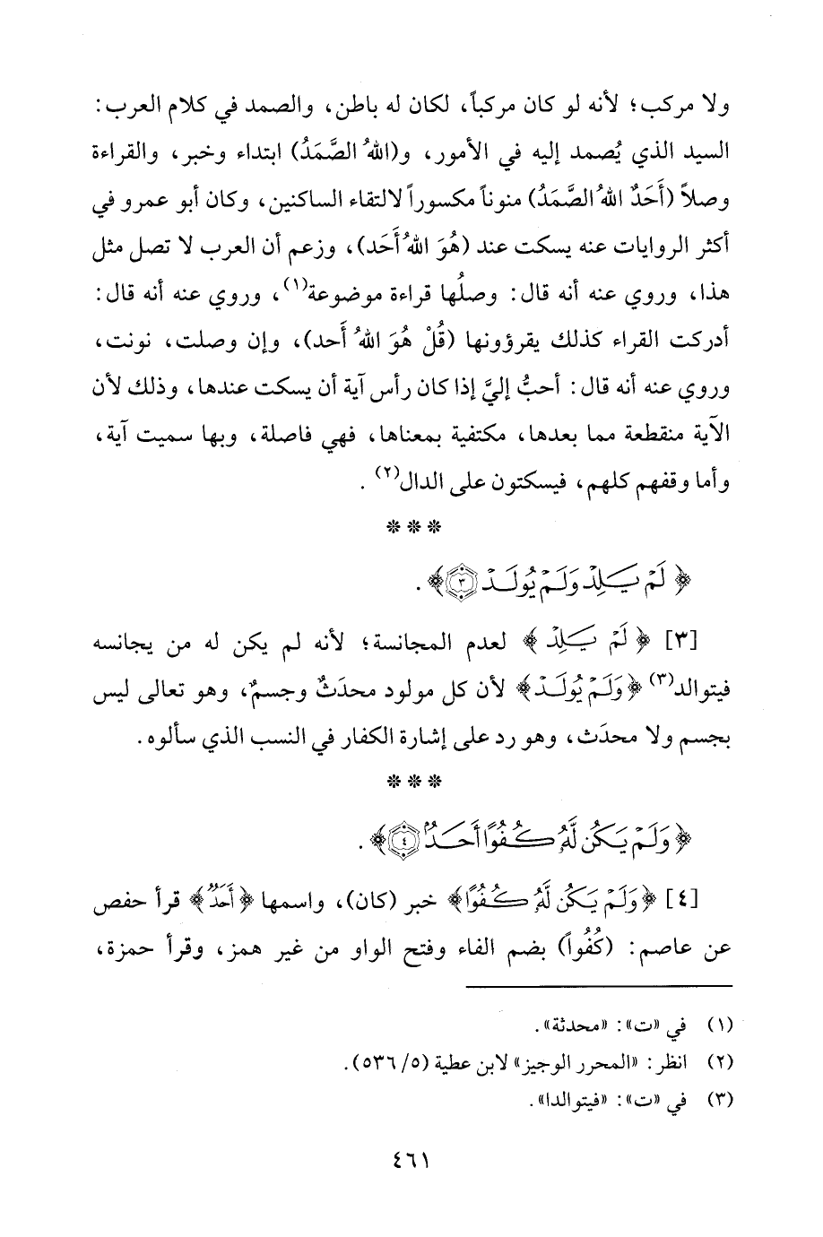 ولا مركب؛ لأنّه لو كان مركبًا، لكان له باطن، والصمد في كلام العرب: السَّيِّد الذي يُصمد إليه في الأمور، و (اللهُ الصَّمَدُ) ابتداء وخبر، والقراءة وصلًا (أَحَدٌ اللهُ الصَّمَدُ) منونًا مكسورًا لالتقاء الساكنين، وكان أبو عمرو في أكثر الروايات عنه يسكت عند (هُوَ اللهُ أَحَد)، وزعم أن العرب لا تصل مثل هذا، وروي عنه أنّه قال: وصلُها قراءة موضوعة (¬1)، وروي عنه أنّه قال: أدركت القراء كذلك يقرؤونها (قُلْ هُوَ اللهُ أَحد)، وإن وصلت، نونت، وروي عنه أنّه قال: أحبُّ إليَّ إذا كان رأس آية أن يسكت عندها، وذلك لأنّ الآية منقطعة ممّا بعدها، مكتفية بمعناها، فهي فاصلة، وبها سميت آية، وأمّا وقفهم كلهم، فيسكتون على الدال (¬2).