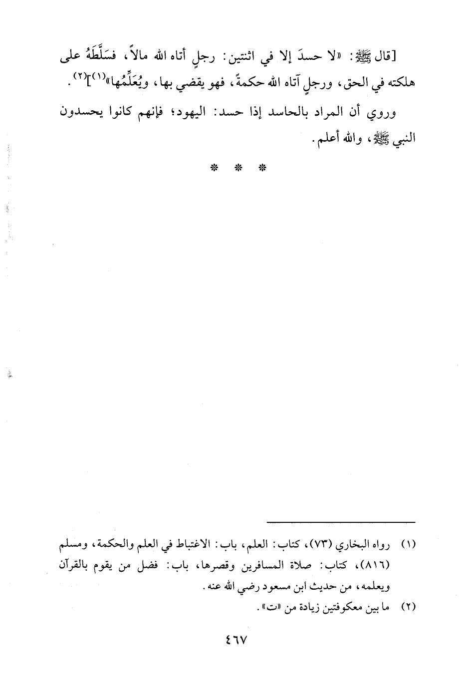 (¬1) رواه البخاريّ (73)، كتاب: العلم، باب: الاغتباط في العلم والحكمة، ومسلم (816)، كتاب: صلاة المسافرين وقصرها، باب: فضل من يقوم بالقرآن ويعلمه، من حديث ابن مسعود رضي الله عنه.
