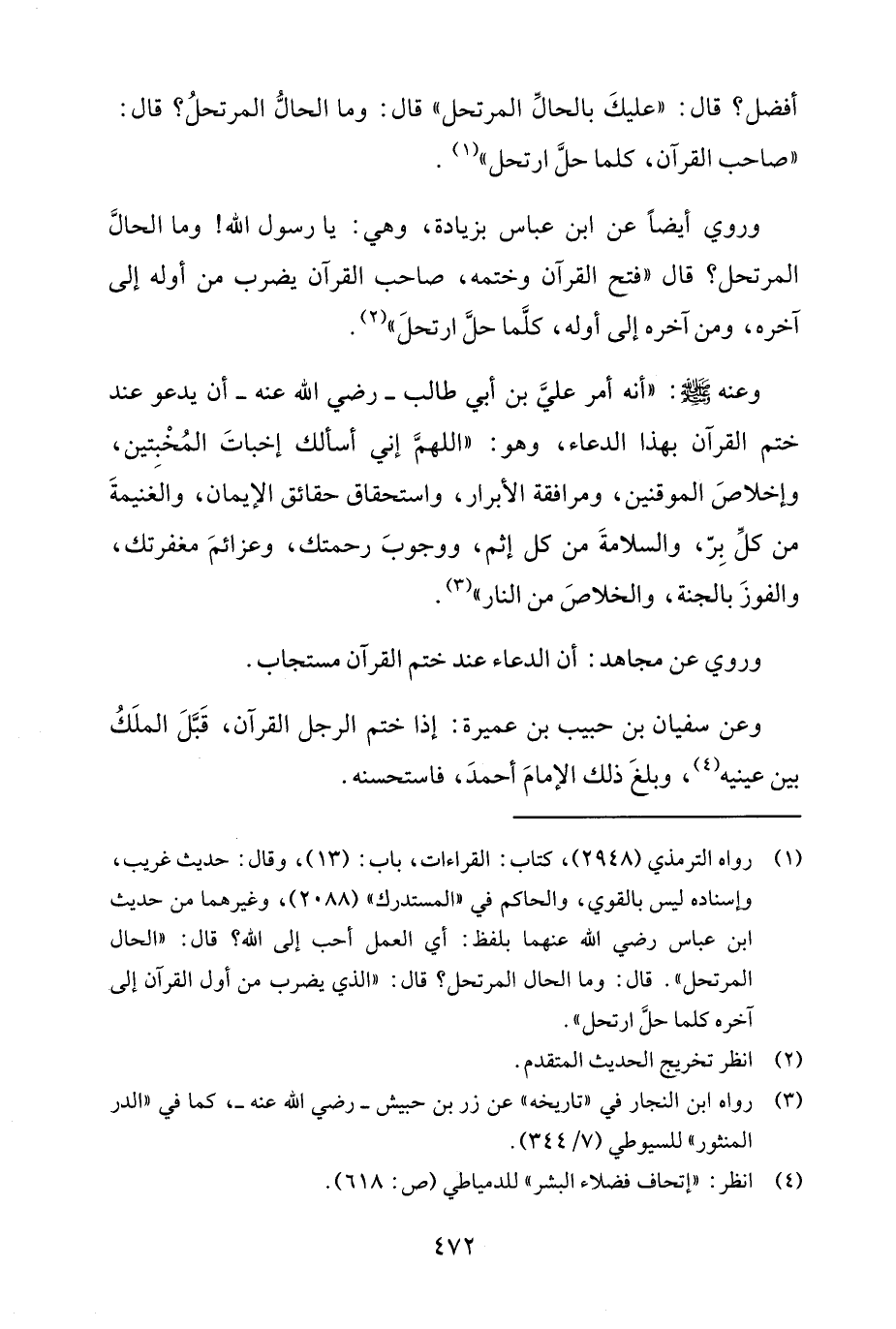 وروي أيضًا عن ابن عبّاس بزيادة، وهي: يا رسول الله! وما الحالَّ المرتحل؟ قال "فتح القرآن وختمه، صاحب القرآن يضرب من أوله إلى آخره، ومن آخره إلى أوله، كلَّما حلَّ ارتحلَ" (¬2).