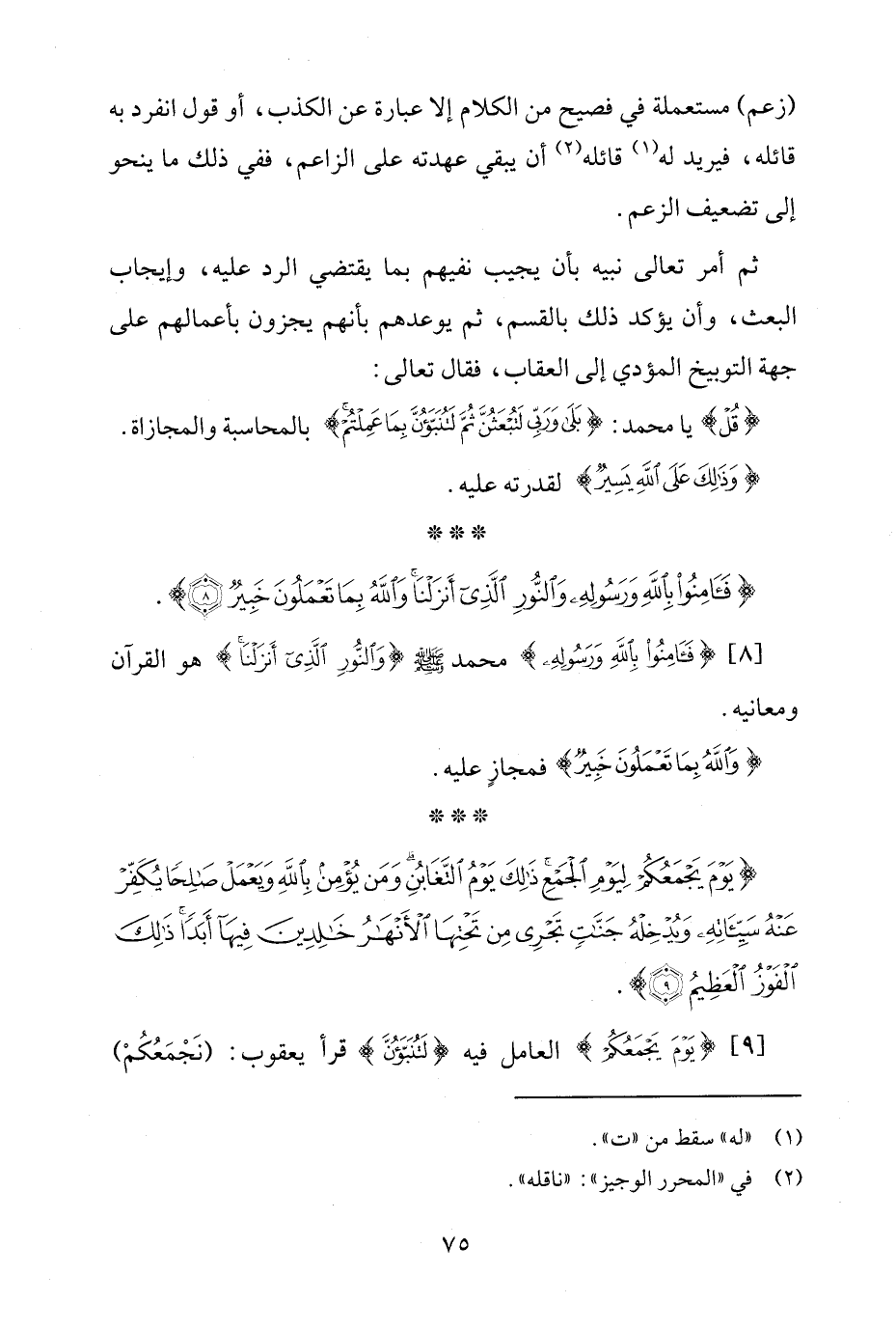 [9] {يَوْمَ يَجْمَعُكُمْ} العامل فيه {لَتُنَبَّؤُنَّ} قرأ يعقوب: (نَجْمَعُكُمْ)