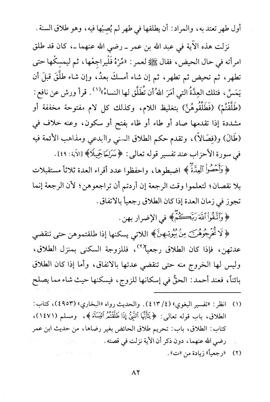 (¬1) انظر: "تفسير البغوي" (4/ 413). والحديث رواه "البخاري" (4953)، كتاب: الطلاق، باب قوله تعالى: {يَاأَيُّهَا النَّبِيُّ إِذَا طَلَّقْتُمُ النِّسَاءَ}، ومسلم (1471)، كتاب: الطلاق، باب: تحريم طلاق الحائض بغير رضاها، من حديث ابن عمر رضي الله عنهما، دون ذكر أن الآية نزلت في قصته.