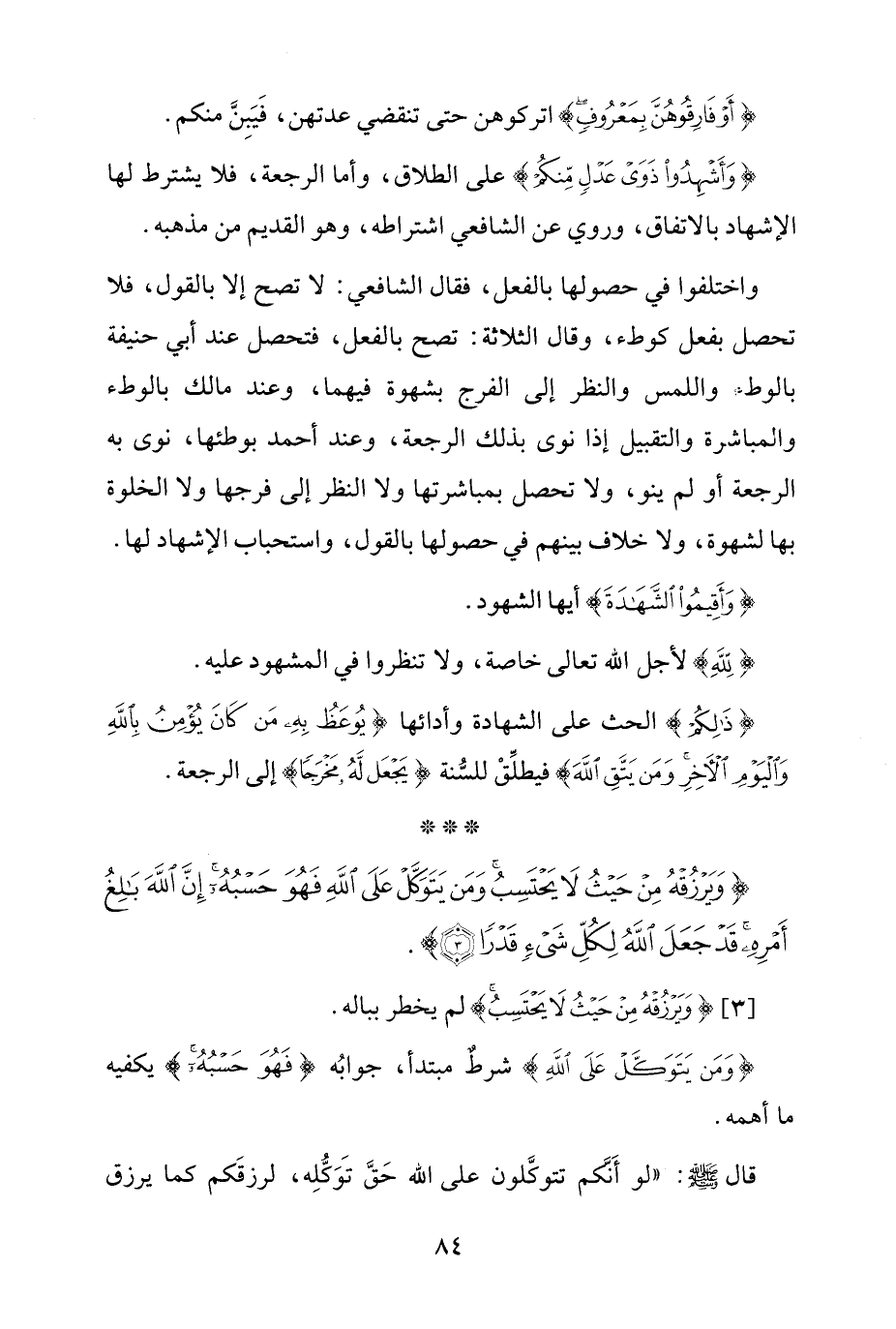 {وَأَشْهِدُوا ذَوَيْ عَدْلٍ مِنْكُمْ} على الطلاق، وأما الرجعة، فلا يشترط لها الإشهاد بالاتفاق، وروي عن الشافعي اشتراطه، وهو القديم من مذهبه.