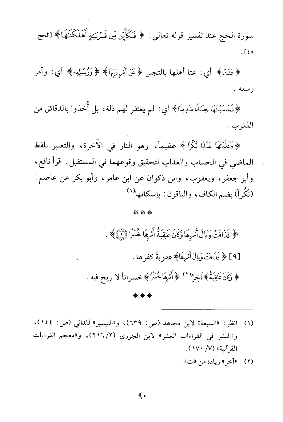 {وَعَذَّبْنَاهَا عَذَابًا نُكْرًا} عظيمًا، وهو النار في الآخرة، والتعبير بلفظ الماضي في الحساب والعذاب لتحقيق وقوعهما في المستقبل. قرأ نافع، وأبو جعفر، ويعقوب، وابن ذكوان عن ابن عامر، وأبو بكر عن عاصم: (نُكُرًا) بضم الكاف، والباقون: بإسكانها (¬1)